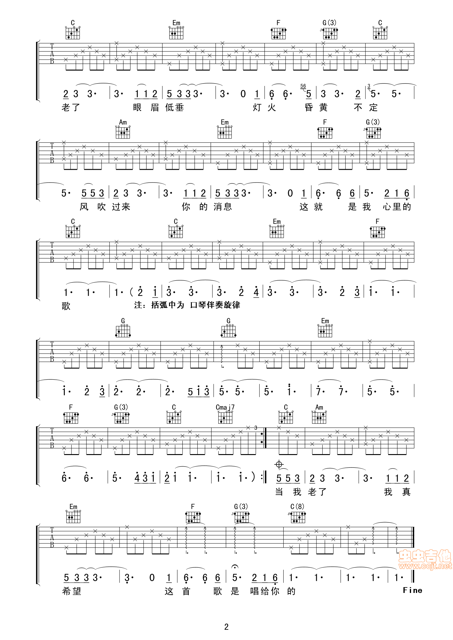 曲谱介绍: 《当你老了(老知了》吉他弹唱谱,共有2张高清图谱,免翻页排版设计。