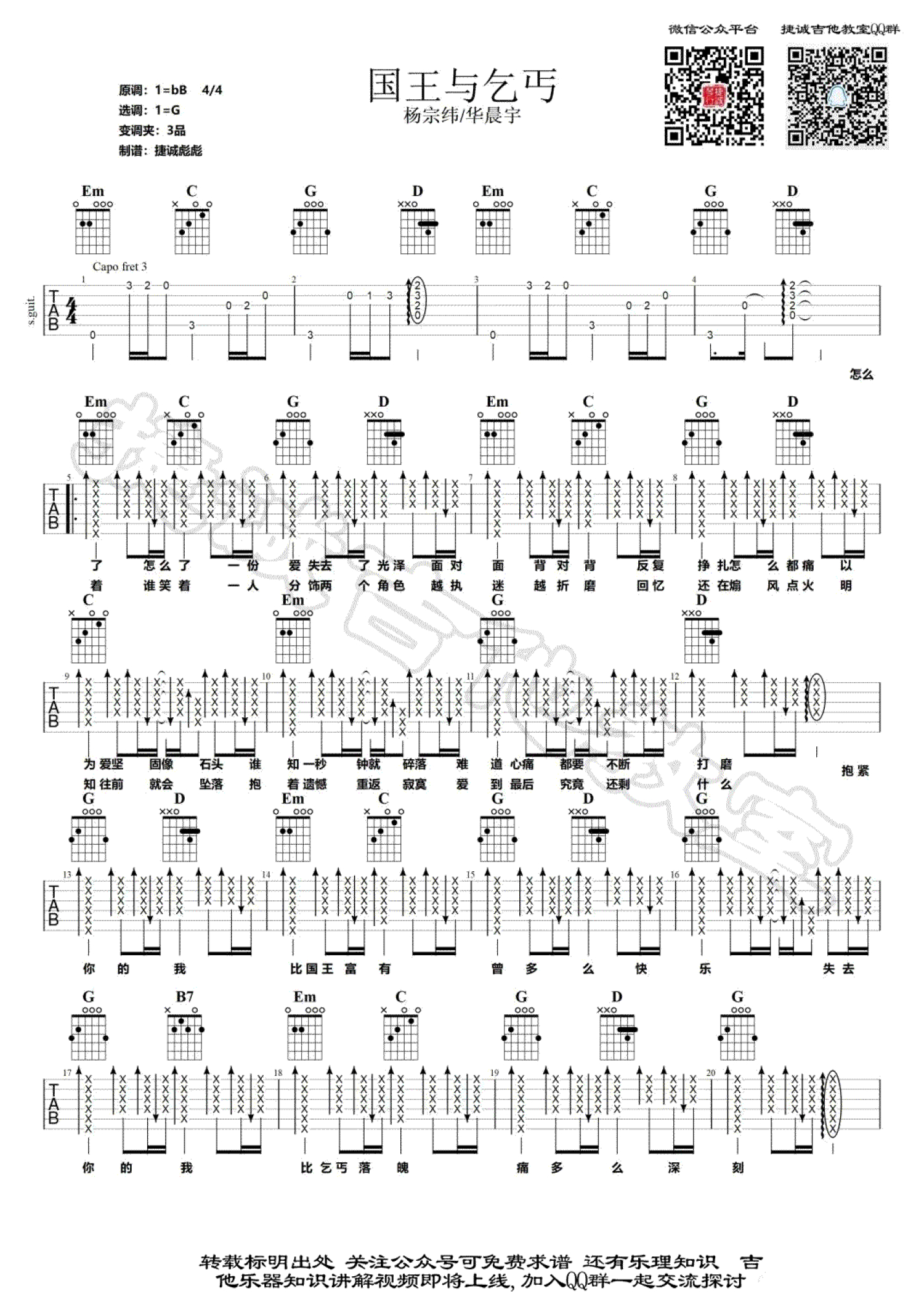 曲谱介绍: 《国王与乞丐》吉他谱,华晨宇与杨宗纬合唱的一首歌曲,国王与乞丐六线谱,原调bB,选调G,变调夹夹第三品,其实,在爱情的世界里,从国王到乞丐的距离,只是有你与无你而已。拥有了你就拥有了全世界,而失去你,就成了悲哀入骨的落魂乞丐。