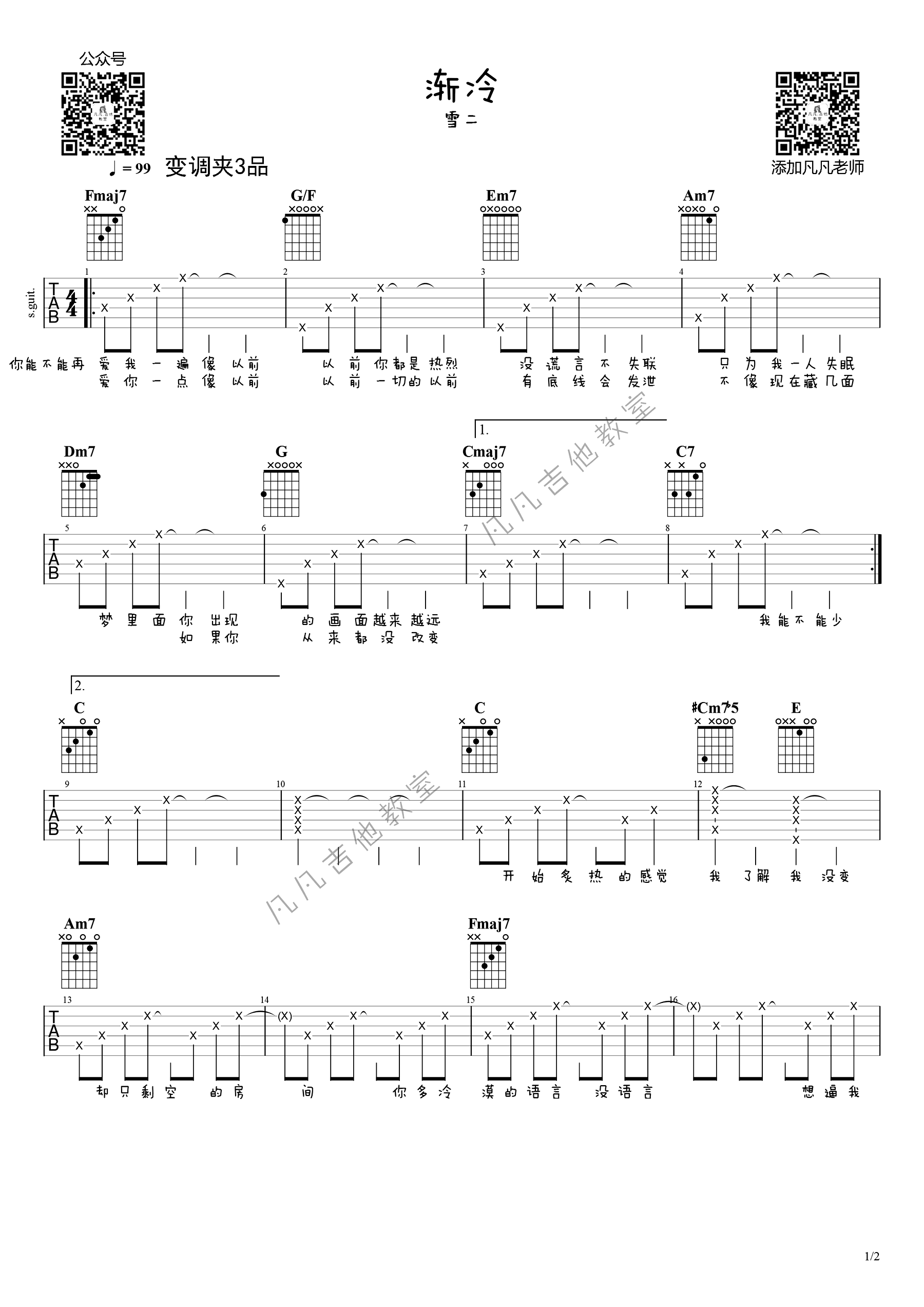 曲谱介绍: 雪二《渐冷》吉他弹唱谱,共有2张高清图谱,免翻页排版设计。