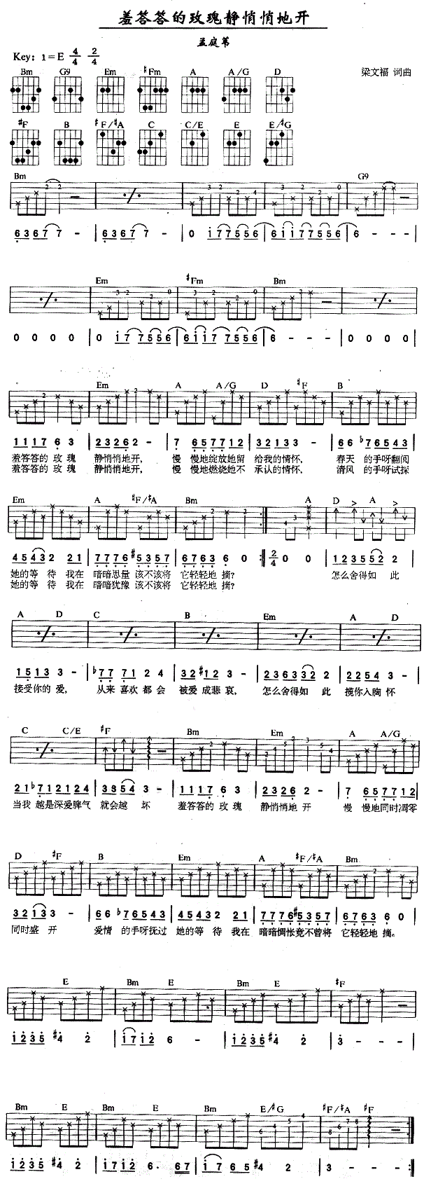 羞答答的玫瑰静悄悄地开 孟庭苇 图片吉他谱 - 羞答答的玫瑰静悄悄地开 - 吉他弹唱谱
