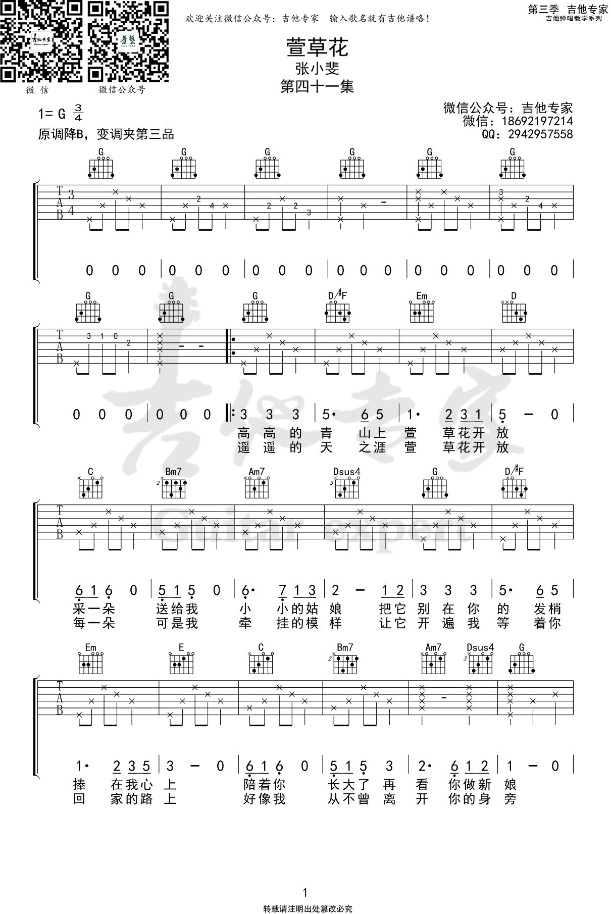 曲谱介绍: 张小斐《萱草花》吉他弹唱谱,共有2张高清图谱,免翻页排版设计。