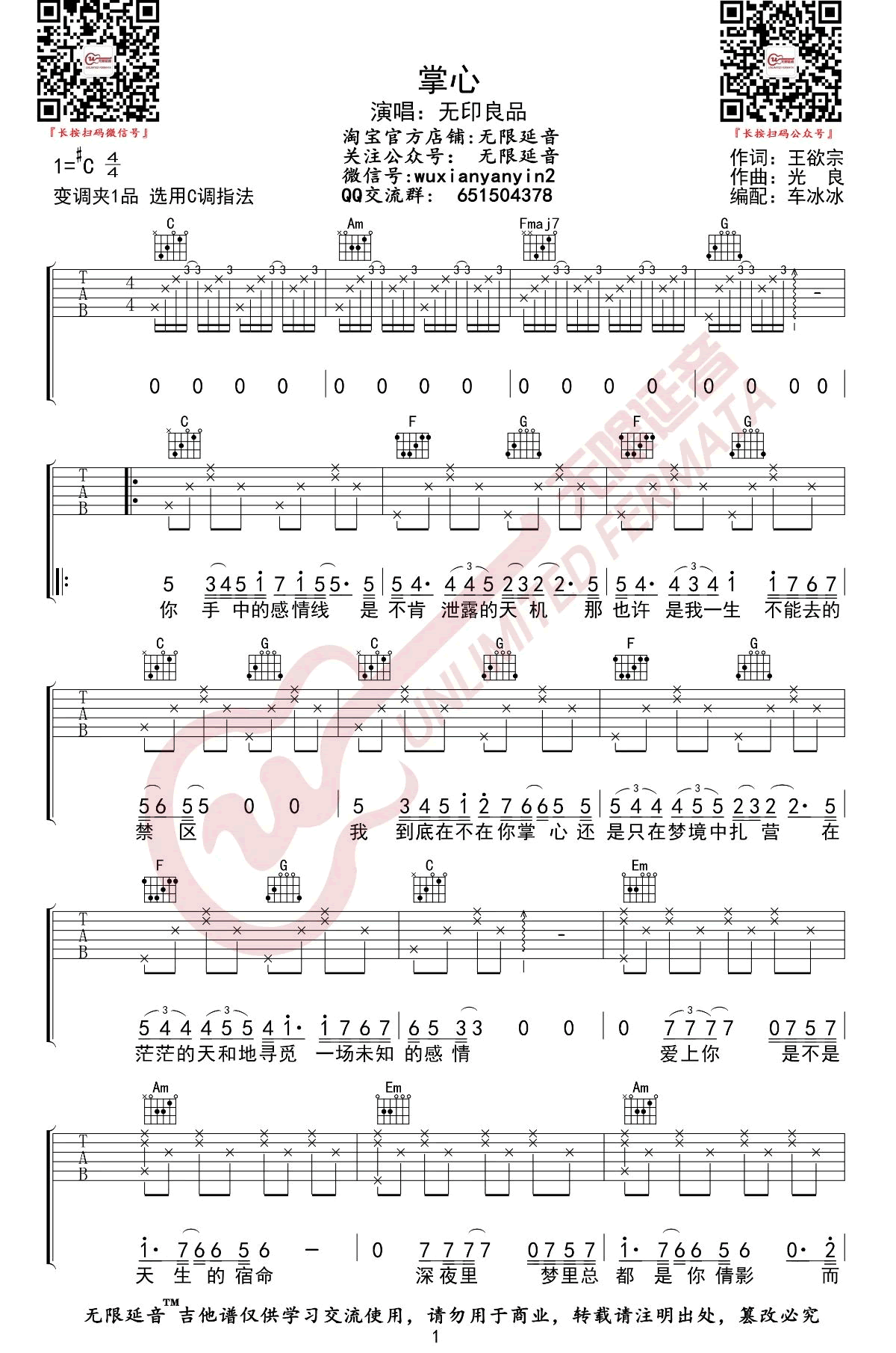 掌心吉他谱 - 无印良品 - 吉他弹唱谱
