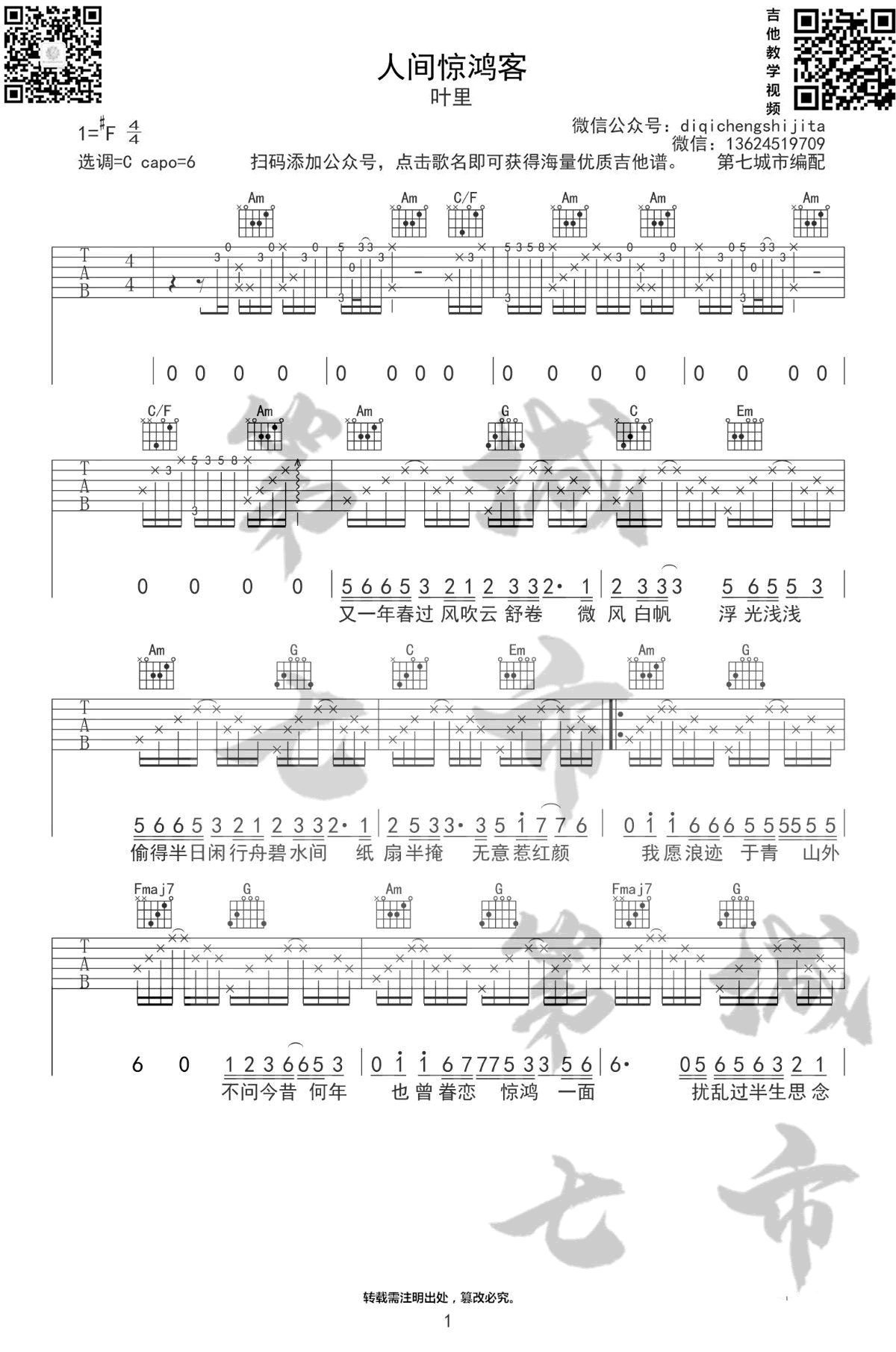 曲谱介绍: 叶里《人间惊鸿客》吉他弹唱谱,共有2张高清图谱,免翻页排版设计。
