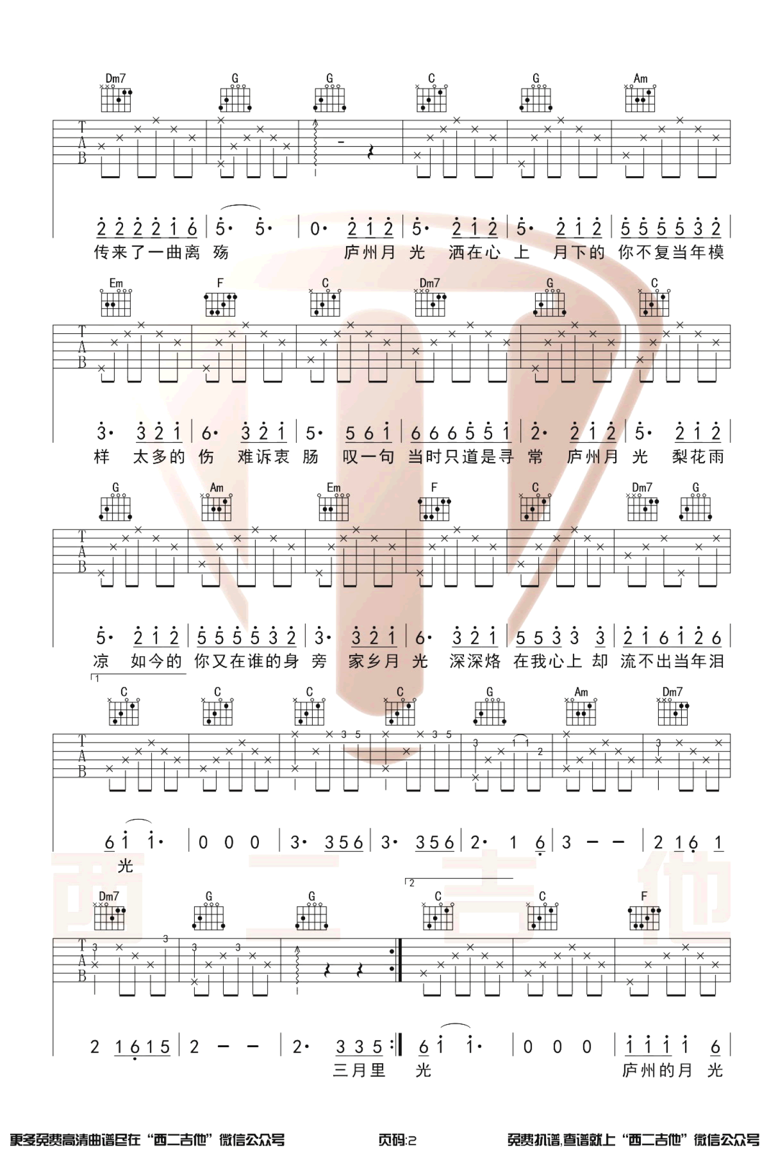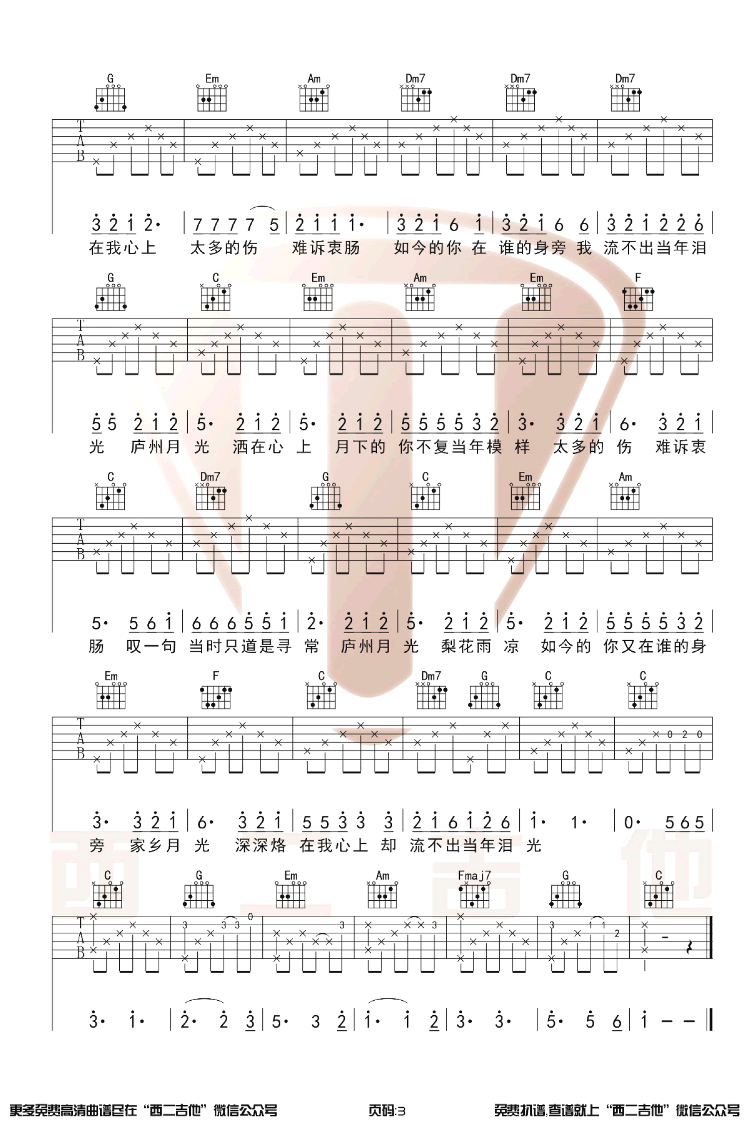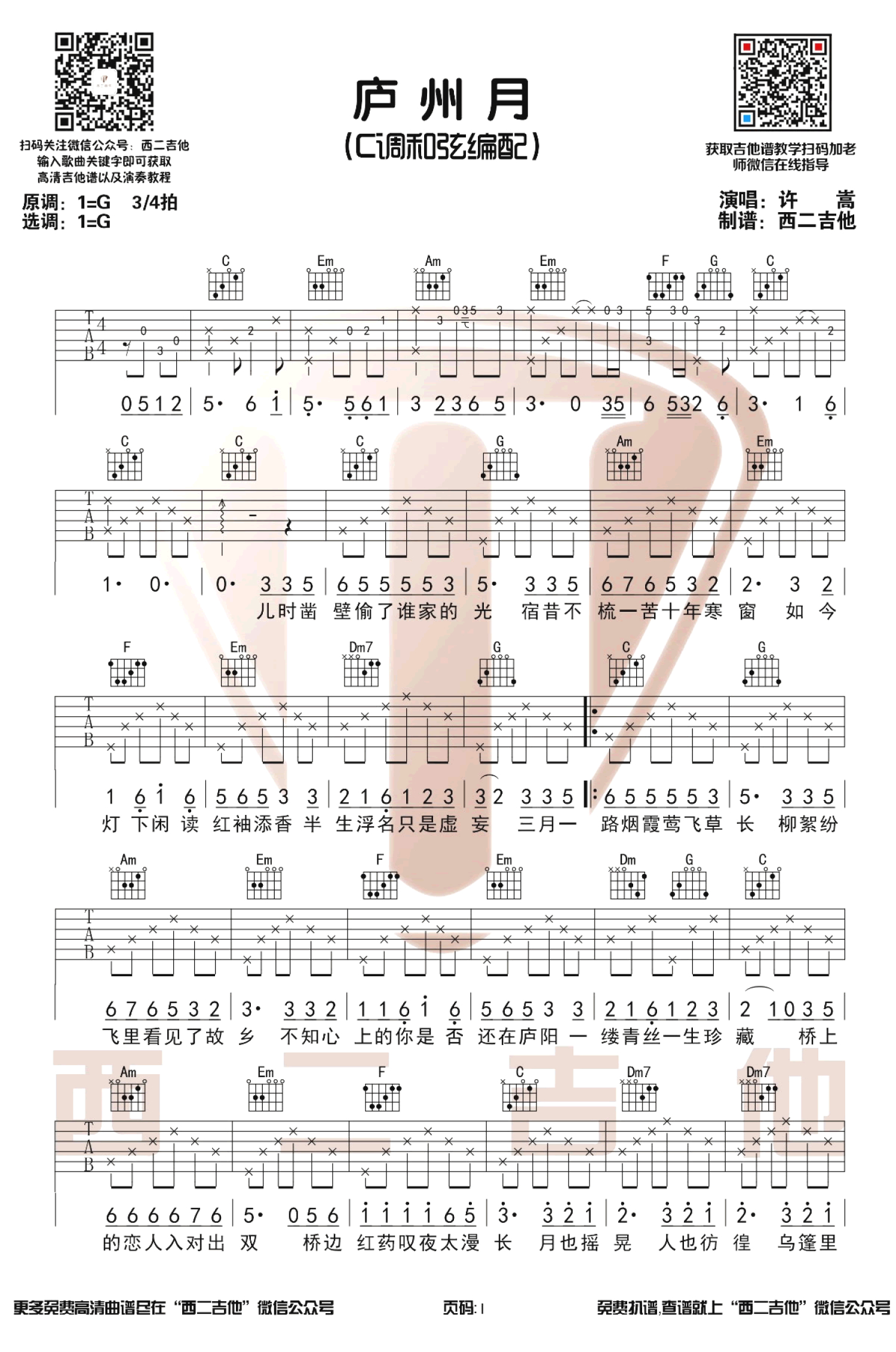 曲谱介绍: 庐州月吉他谱,许嵩演唱的一首绵延一贯的中国风清新,充满了行云流水细腻的韵味,庐州月六线谱,C调和弦编配,总有人说:月是故乡明,当许嵩歌曲中的主人公看到月亮的时候也想起了曾经故乡深爱的那位姑娘,于是就有了这首充满诗词画意的歌曲