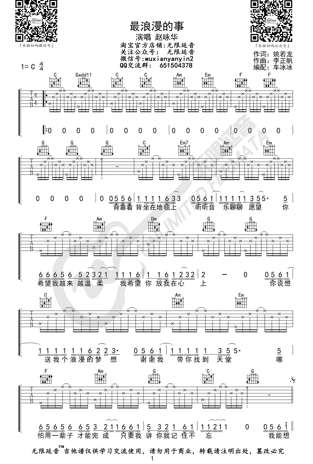 曲谱介绍: 赵咏华《最浪漫的事》吉他弹唱谱,共有2张高清图谱,免翻页排版设计。