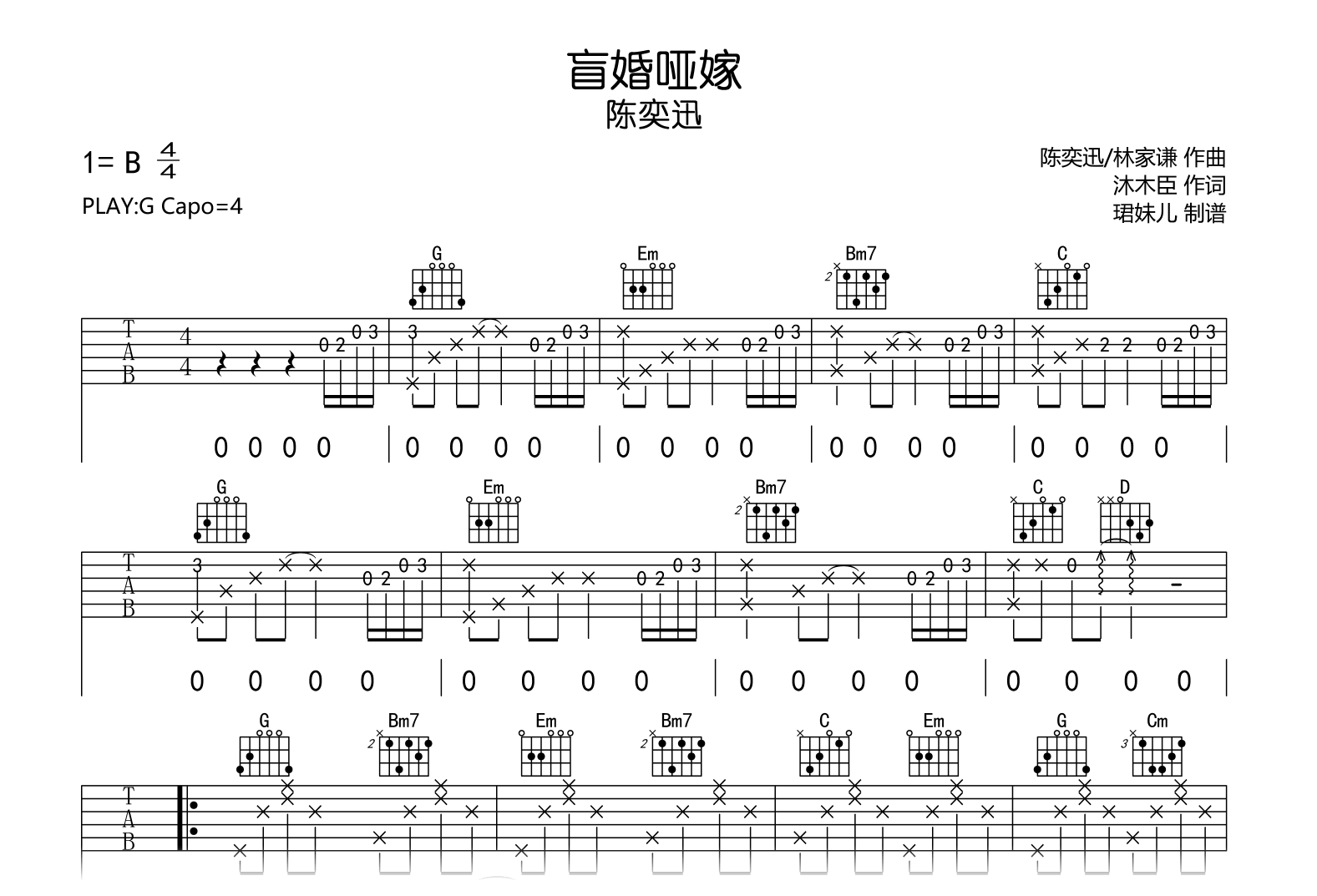 曲谱介绍: 盲婚哑嫁吉他谱,陈奕迅演唱粤语新歌。《盲婚哑嫁》吉他弹唱谱,采用G调指法编配,弹唱建议变调夹4品,原调为B,演奏速度85BPM,易上手难度较简单。