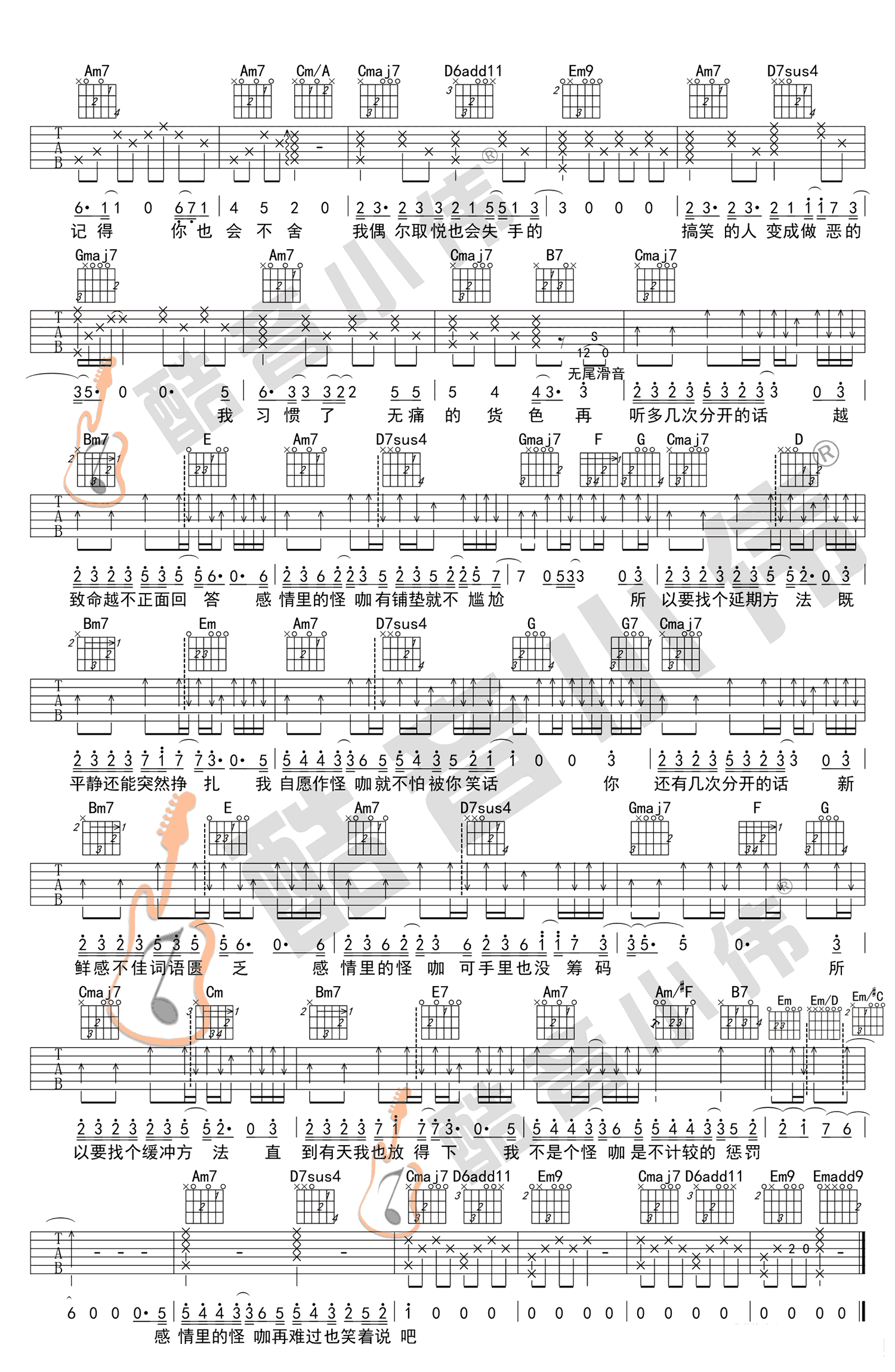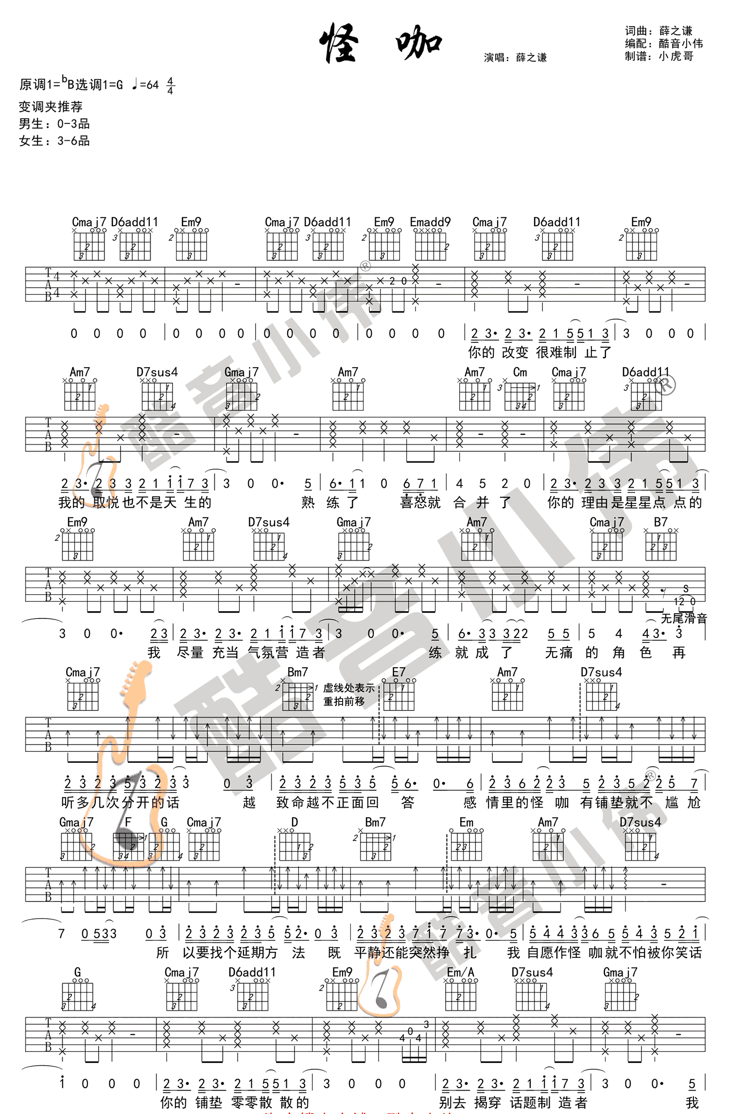 曲谱介绍: 薛之谦《怪咖》吉他谱,G调中级版,原调bB,,变调夹推荐,男生0-3品,女生3-6品。在综艺节目《无限歌谣季》中,薛之谦与杨迪合唱的一首原创歌曲,怪咖六线谱,酷音小伟编配出品。随谱附上配套吉他弹唱教学视频,琴友们跟随小伟老师的示范讲解练习起来吧。一首深情演绎的歌曲,娓娓唱出情感世界里的怪咖,人前嬉笑人后垂泪的哀伤故事。