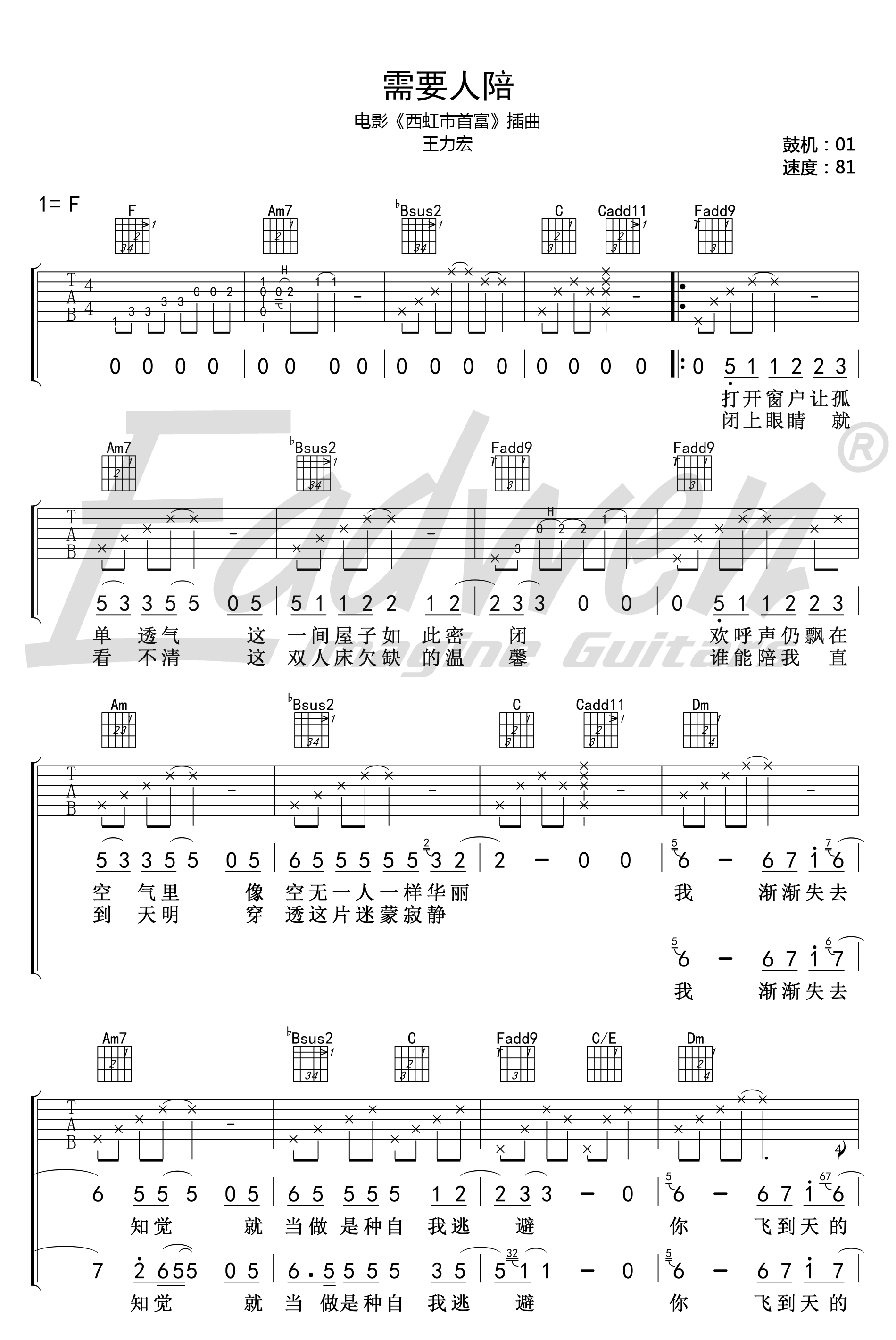 曲谱介绍: 王力宏《需要人陪》吉他谱,F调弹唱谱,高清图片谱,电影《西虹市首富》插曲,需要人陪六线谱,爱德文吉他编配出品,感谢陈佰老师带来曲谱配套的吉他弹唱教学视频。“一个我需要梦想,需要方向,需要眼泪,更需要一个人来点亮天的黑”,一首深情彻骨的经典老歌,舒缓的旋律,温润磁性的声线,唱出了每个都市人内心孤寂。
