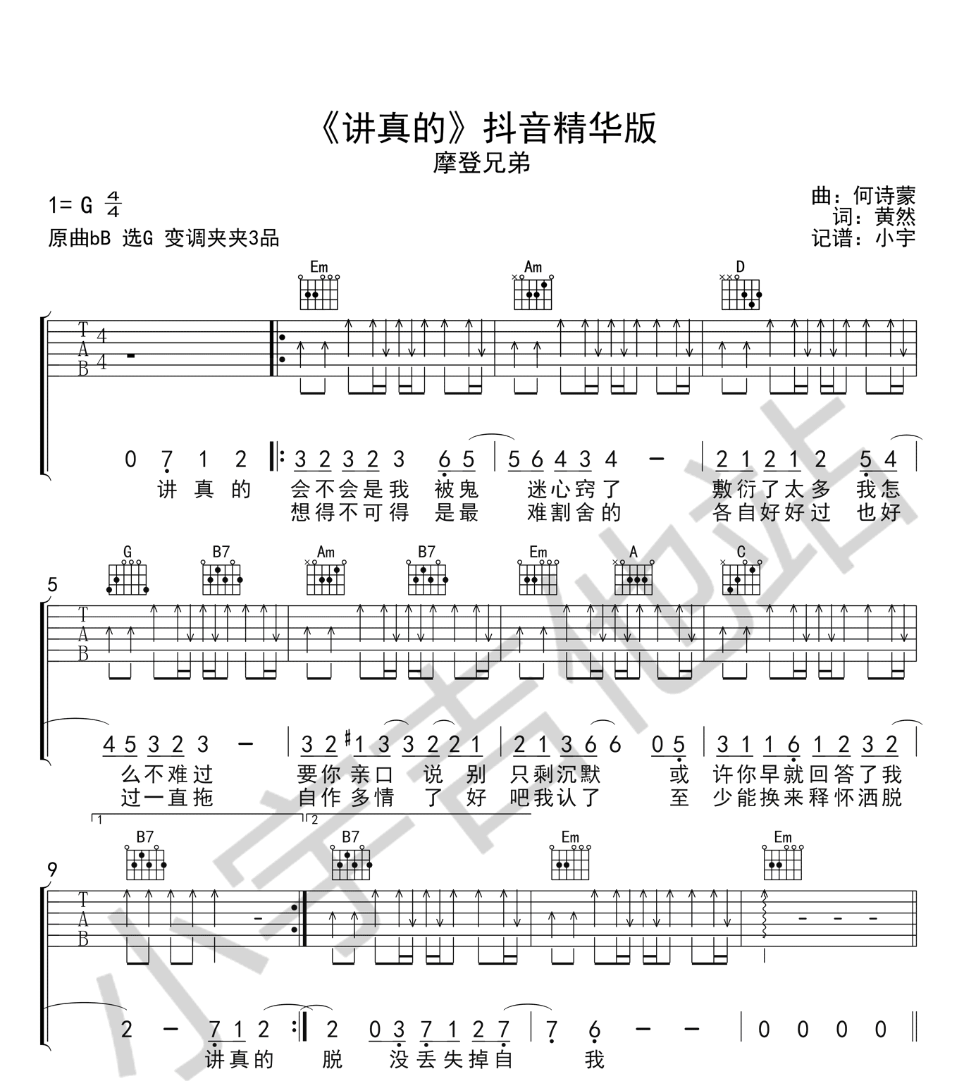曲谱介绍: 《讲真的》吉他谱,曾惜李袁杰演唱的一首热门网络歌曲,原曲bE,选用C调,变调夹夹三品,讲真的六线谱,女声原版,小宇吉他站编配出品。 这首歌的吉他前奏编的很不错,琴友们多多留意低音弦bass line (贝斯线条)营造出的律动~ 是这个前奏的精华~