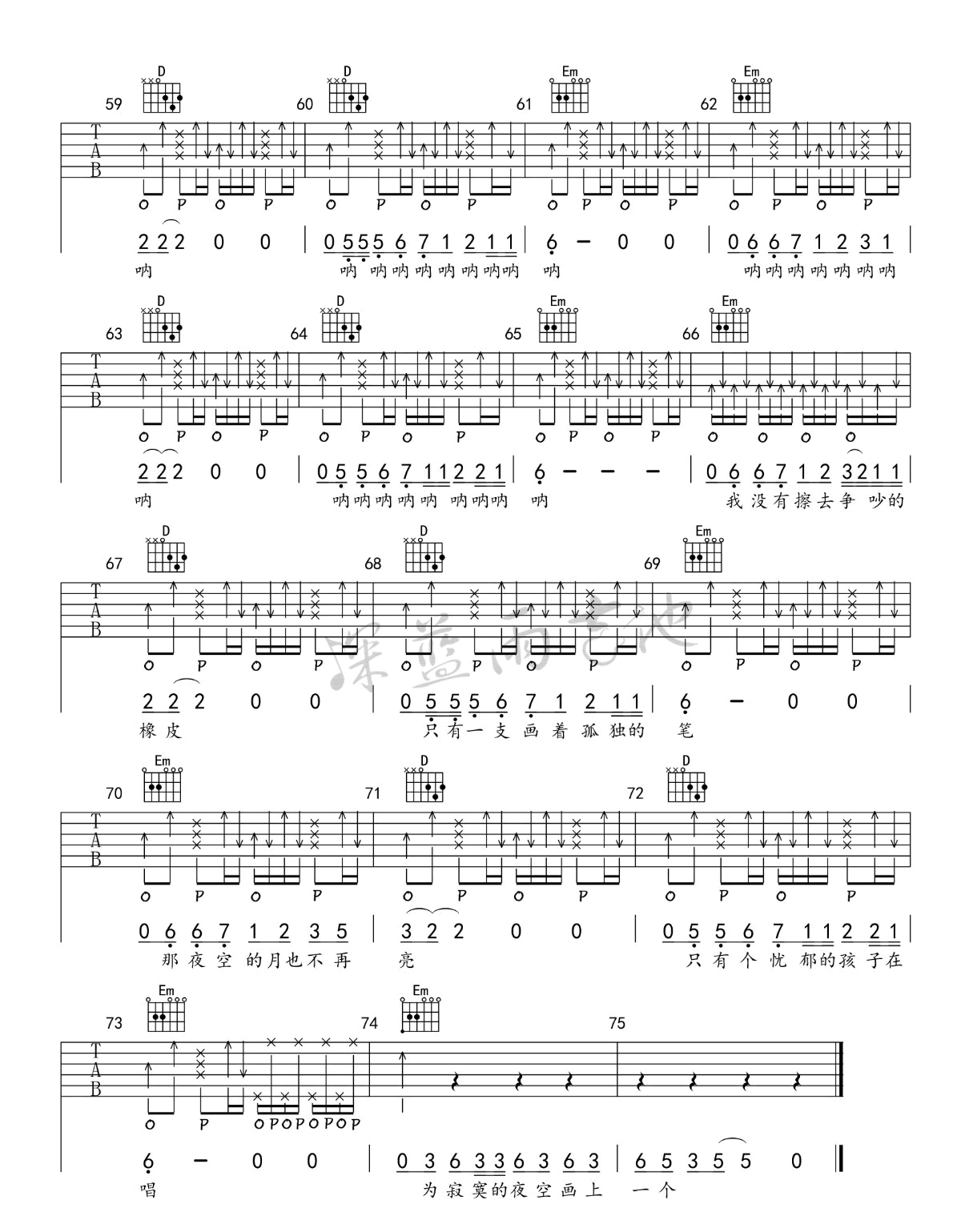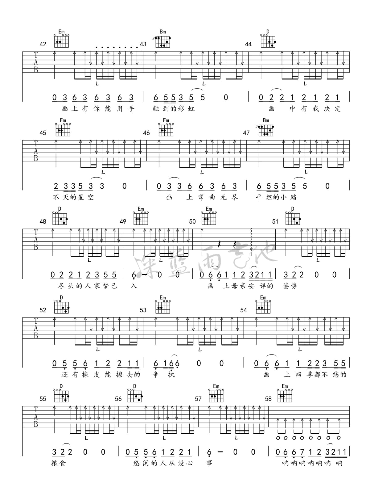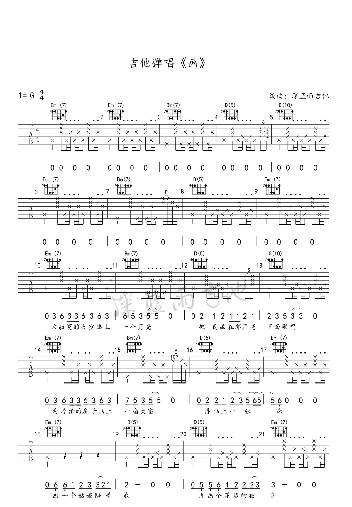 曲谱介绍: 赵雷《画》吉他谱,赵雷一首好听的民谣创作歌曲,画六线谱,G调指法,高清弹唱图片谱,深蓝雨吉他编配出品。这首歌是不是我们所向往的田园生活,能不能和你产生内心的共鸣?拿起吉他,让我们在忙忙碌碌的学习和工作之余,也放松放松遐想遐想!