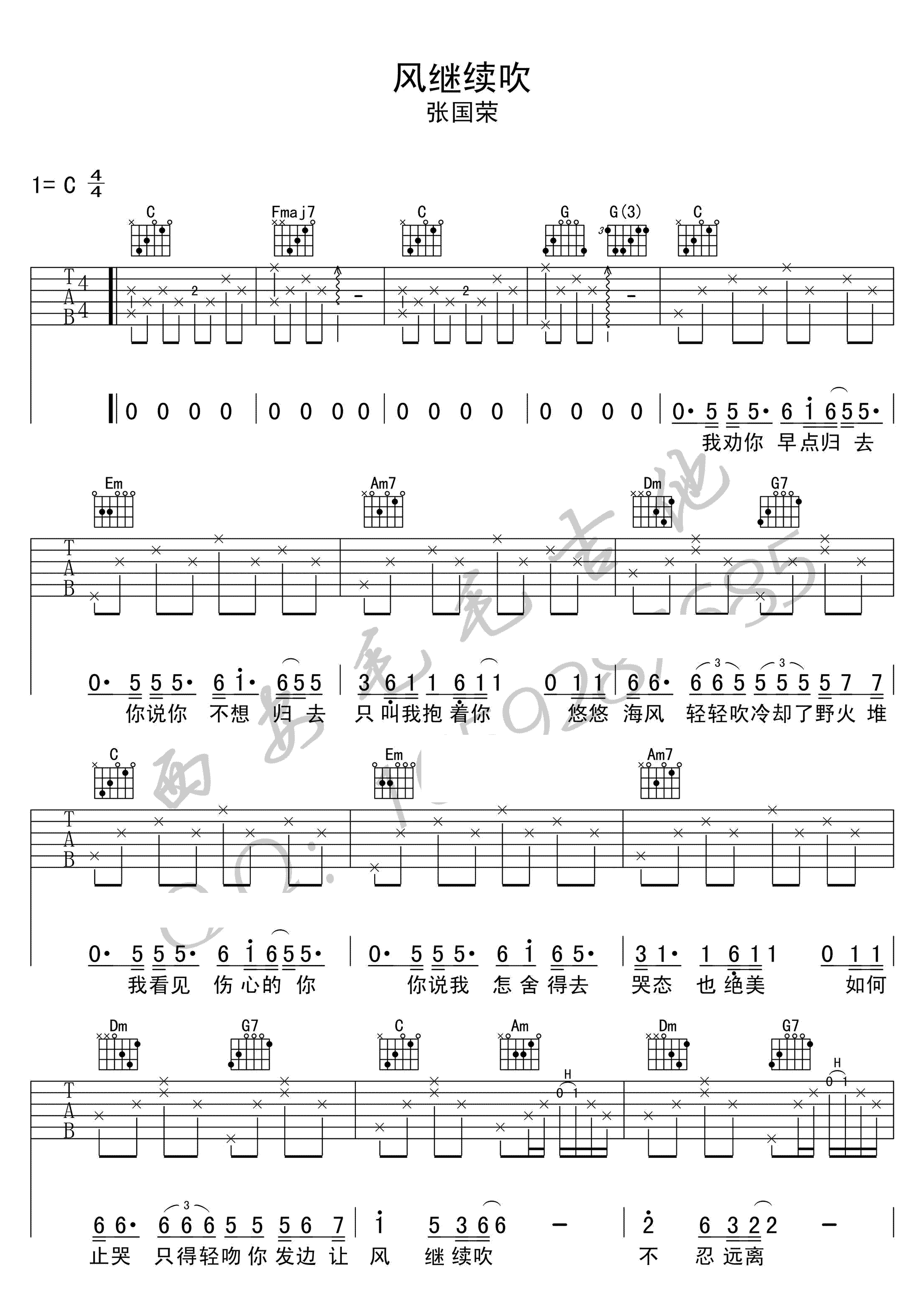 曲谱介绍: 张国荣《风继续吹》吉他谱,C调弹唱谱,一首经典粤语歌曲,风继续吹六线谱,高清图片谱,毛毛吉他编配出品。