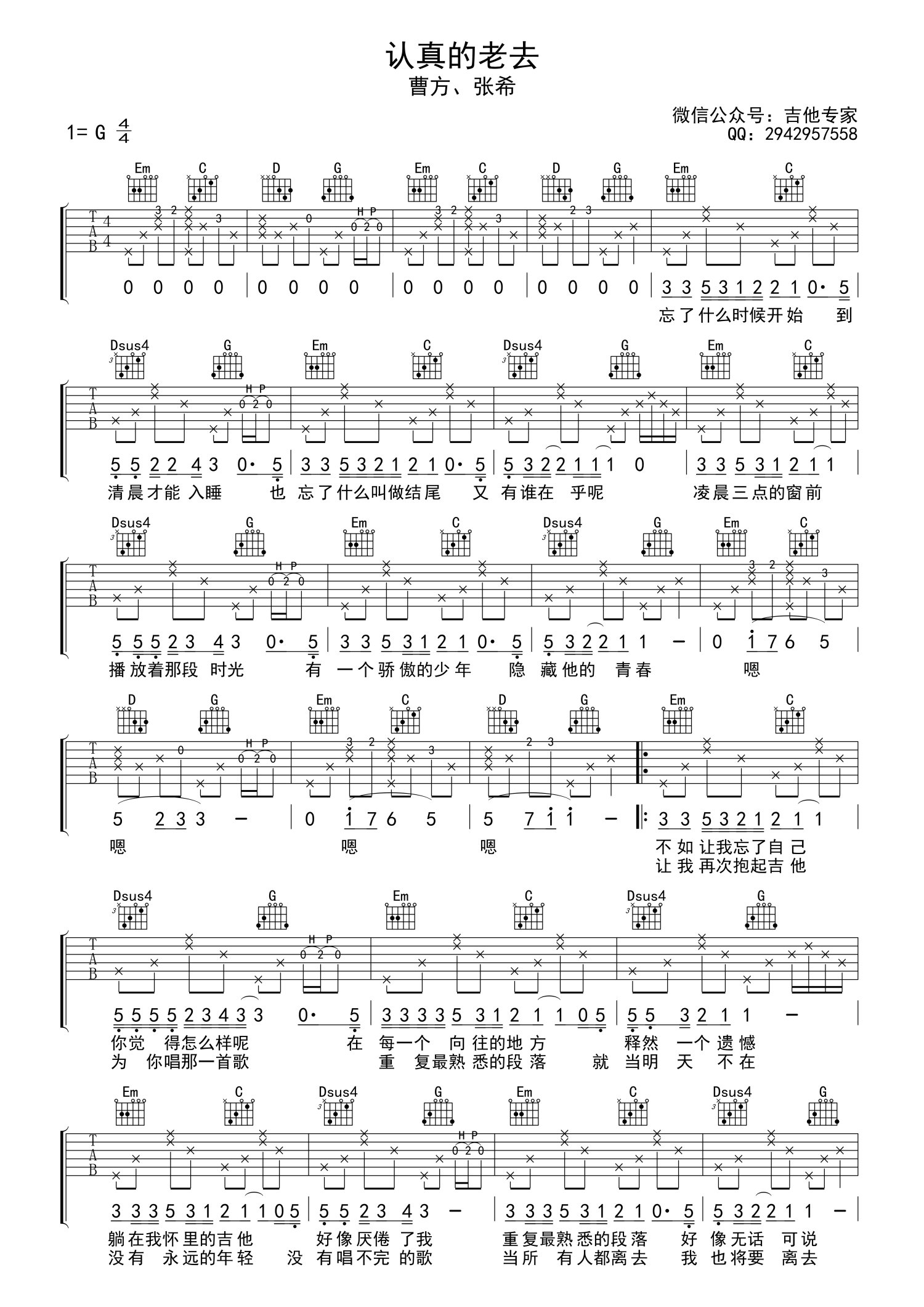 • 认真的老去吉他谱 - 曹方张希 - G调吉他弹唱谱第1张