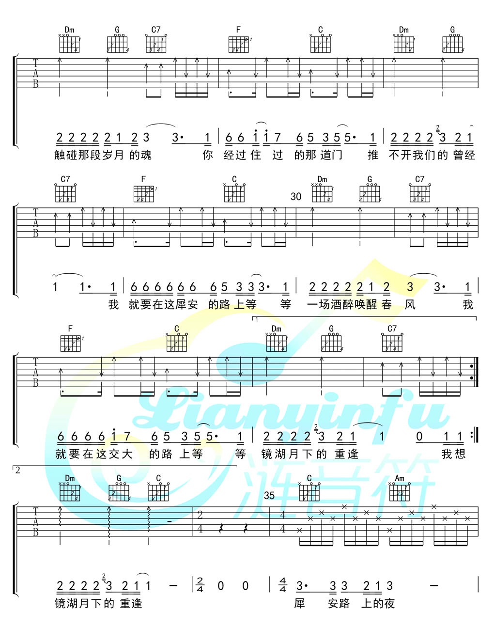 曲谱介绍: 赵照演唱的犀安路999号吉他谱,本页面为《犀安路999号》六线谱高清图片后两张谱例,感谢白健平编配分享。校园民谣《犀安路999号》,由西南交通大学党委副书记桂富强教授作词,独立音乐人民谣歌者赵照作曲并演唱。