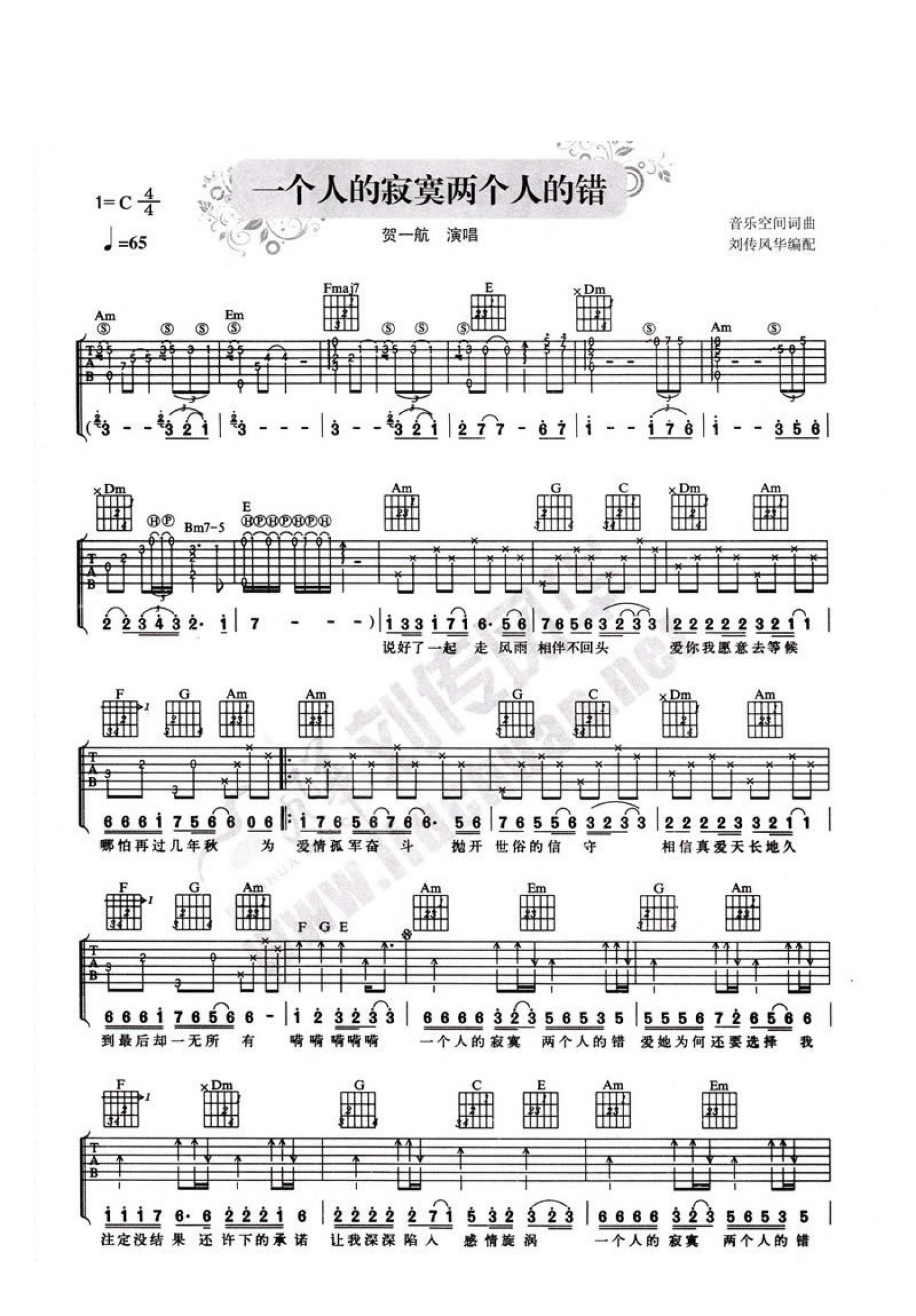 曲谱介绍: 贺一航《一个人的寂寞两个人的错》吉他谱_C调吉他弹唱谱