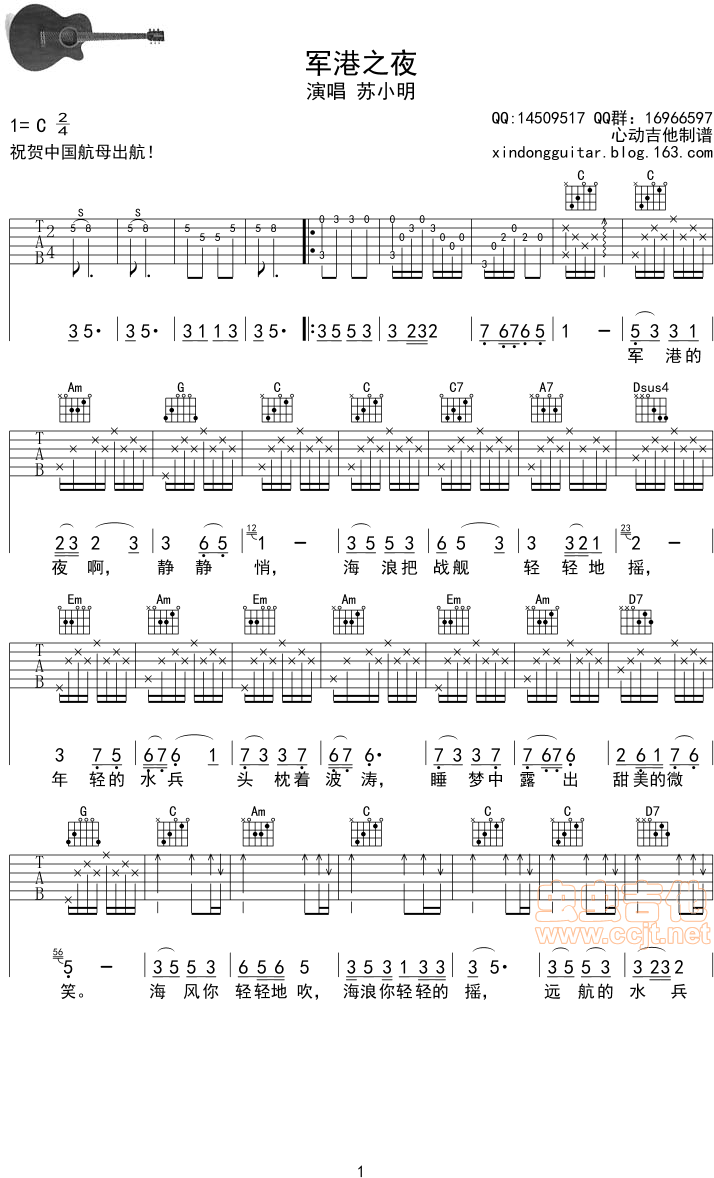 曲谱介绍: 《军港之夜》吉他弹唱谱,共有2张高清图谱,免翻页排版设计。