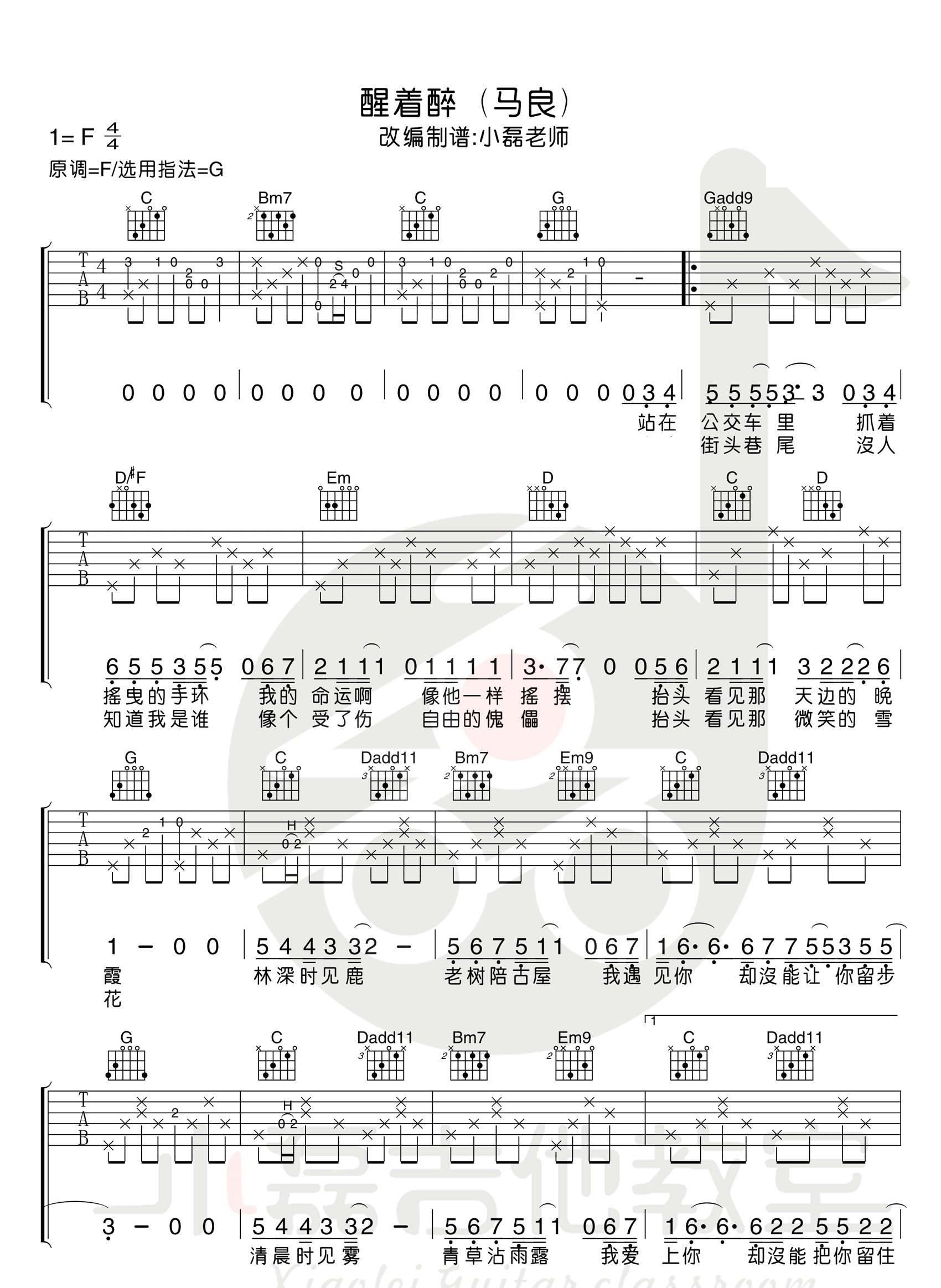 曲谱介绍: 马良《醒着醉》吉他谱,原调F,选用C调指法,小磊吉他编配出品。关于乐谱与教学! 这首歌原版是F调的,所以大家可以在网上看到大量的乐谱是C调指法,变调夹夹在5品的乐谱! 这也是目前做乐谱的常态,大家都太固守规则了! 老师制作的这个乐谱是G调指法,相比原版的F调属于升了一个整调,但是实际演唱发现,并没有觉得唱不上去,因为原版也不高! 我们如果用C调指法,变调夹在5品的话,吉他的声音由于变调夹品位太高,声音注定会很尖锐,所以这里我们用到G调指法,比较合适! 乐谱定调直接可以影响一首歌的指法以及和弦编排!不代表原调就是合适的,而要为弹唱服务,只要唱着舒服,其次才要考虑指法调式! 这首歌的学习重点在于前奏与间奏,还有一些过门的小细节,整体难度不是很高,歌曲也偏慢速,所以很适合民谣范儿的同学作为小众拿手曲目收藏起来! 难度:4级!