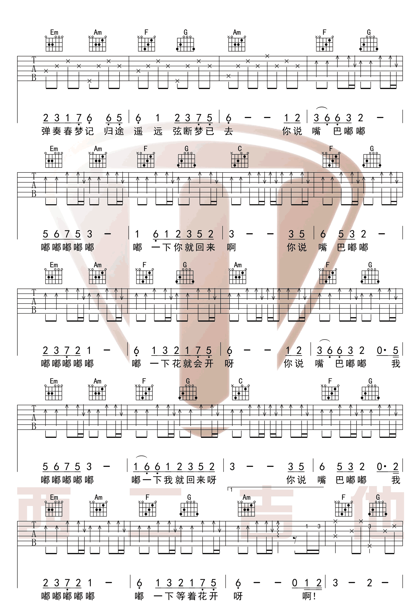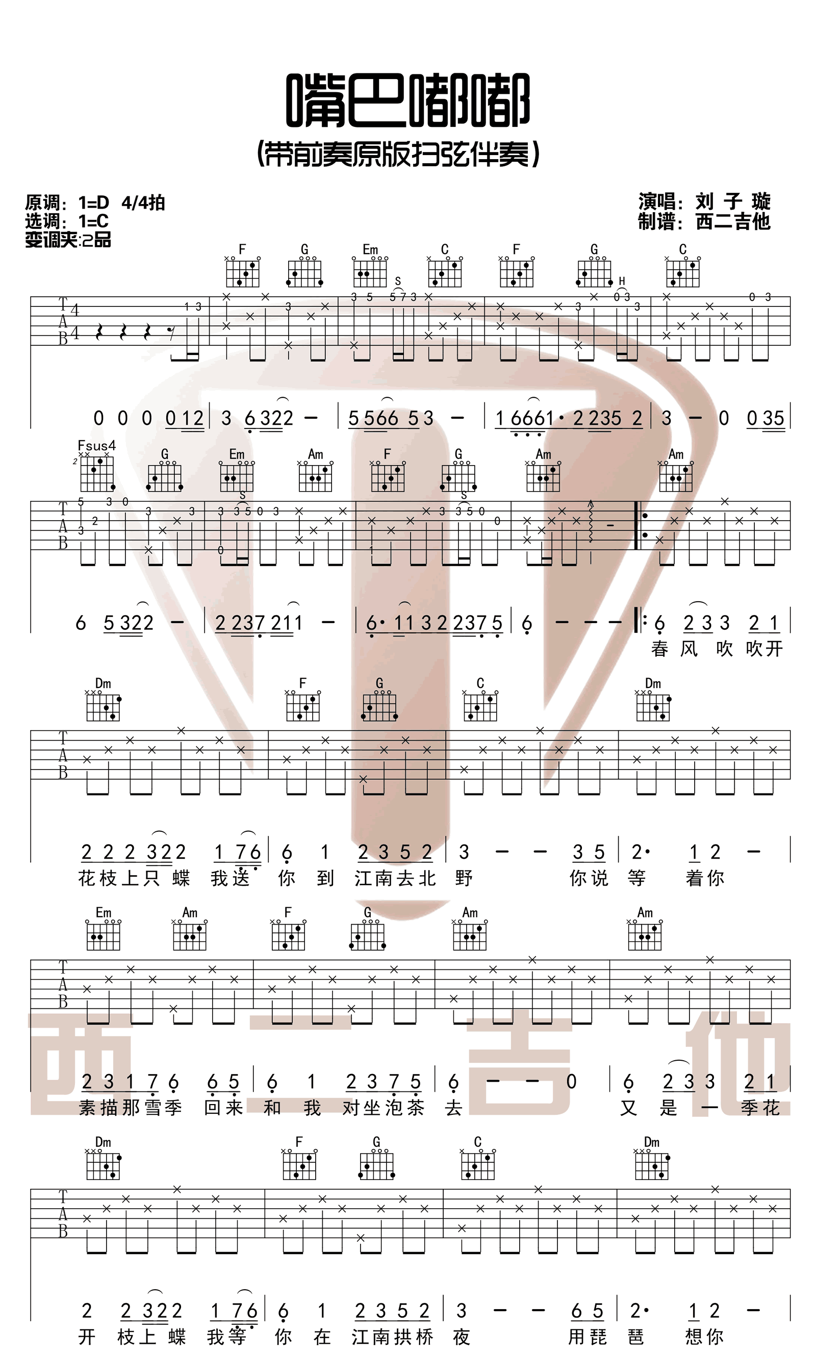 曲谱介绍: 刘子璇《嘴巴嘟嘟》吉他谱,带前奏原版扫弦伴奏,原调D,四四拍,选用C调,变调夹夹二品。一首网络神曲,喜欢刷短视频的琴友们一定被它洗脑。嘴巴嘟嘟六线谱,西二吉他编配出品。 清亮的歌声略带古风的旋律,唱出一个让人无奈的爱情故事,一句“等你回来”却再无回音,给整首歌画上遗憾的句点。