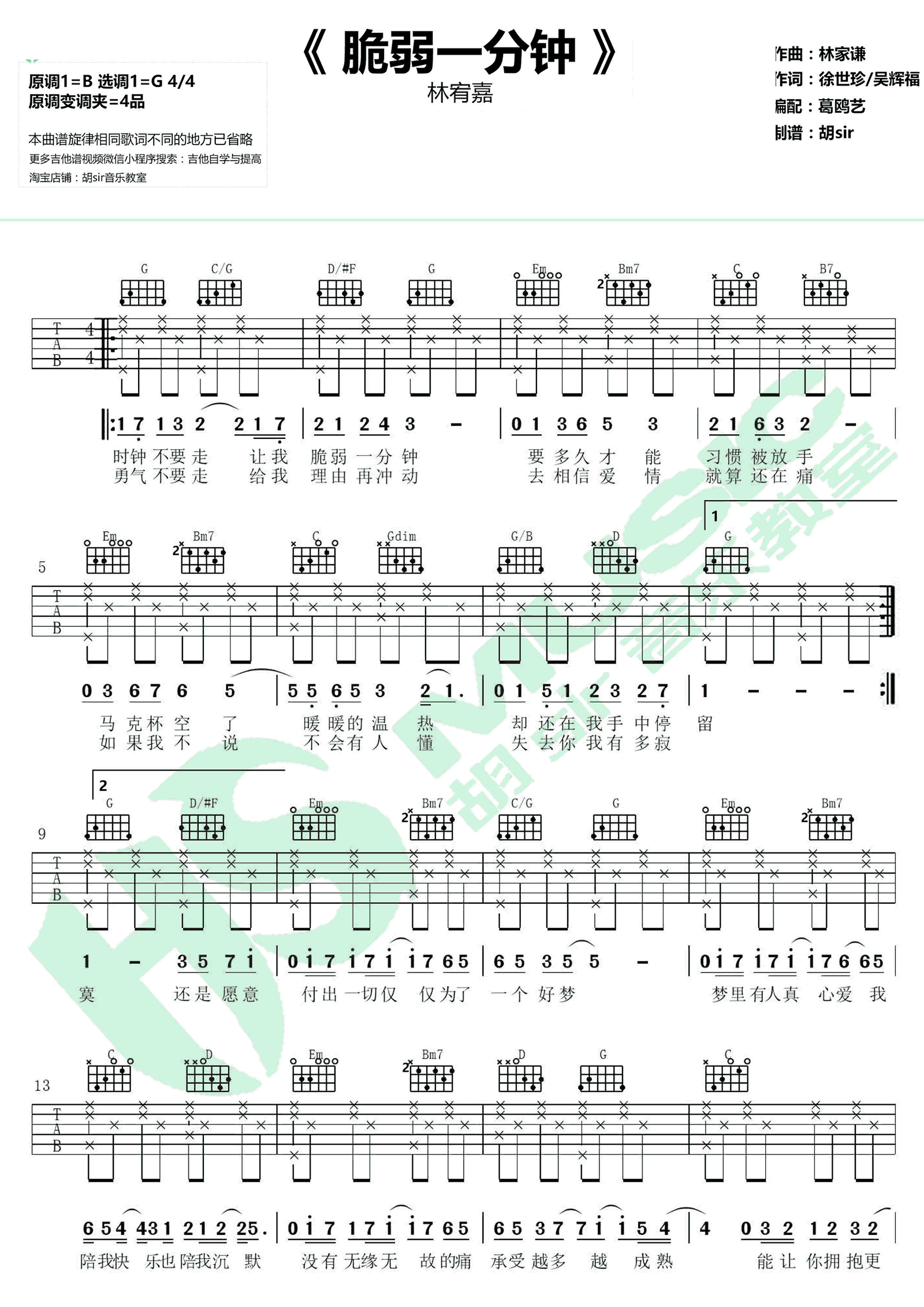 曲谱介绍: 林宥嘉《脆弱一分钟》吉他谱,G调指法编配,变调夹夹四品为原调B调。林宥嘉为电视剧《爱情进化论》演唱的片头曲,以低音吟唱出疗愈力量。脆弱一分钟吉他弹唱谱,高清图片六线谱,胡Sir音乐教室出品,欢迎琴友们扫码关注,有系统的一起学习和提高琴谱网。