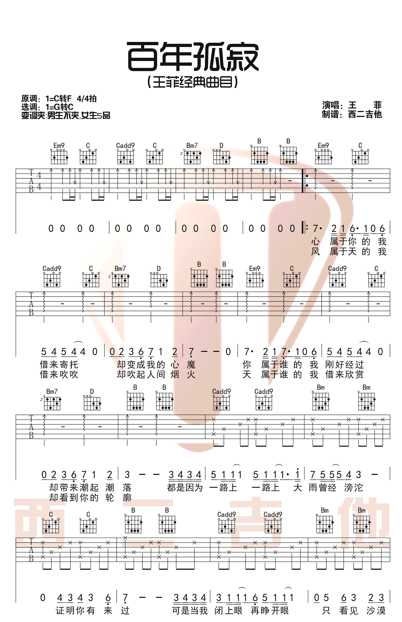 曲谱介绍: 王菲《百年孤寂》吉他谱,G转C调,变调夹男生不夹,女生夹五品。 女神王菲非常经典的一首歌,主歌部分是一个调,副歌部分是另一个调,这种变调方式使得演唱起来更有冲击力,如果你没有听过这首歌,我推荐你听一下,绝对不会失望,如果你听过这首歌,那就拿着谱子练练吧!