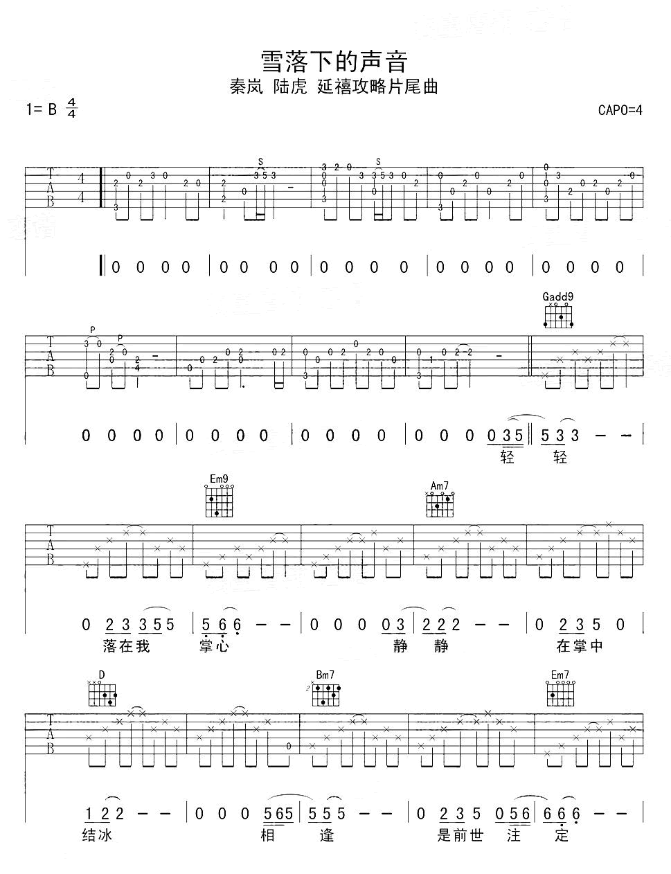 曲谱介绍: 雪落下的声音吉他谱,秦岚陆虎演唱,热播爆火网剧《延禧攻略》片尾曲,雪落下的声音吉他弹唱谱,Capo夹四品,曲谱来源吉快。 《雪落下的声音》旋律节奏不急不躁,曲调萧索清幽,闭眼仿佛置身于宫廷中,窗外便是大雪纷飞,染力极强。搭配无奈忧伤的歌词,让人心底生出一声叹息。歌声响起,让人想起了在大雪天里三步一叩的璎珞。