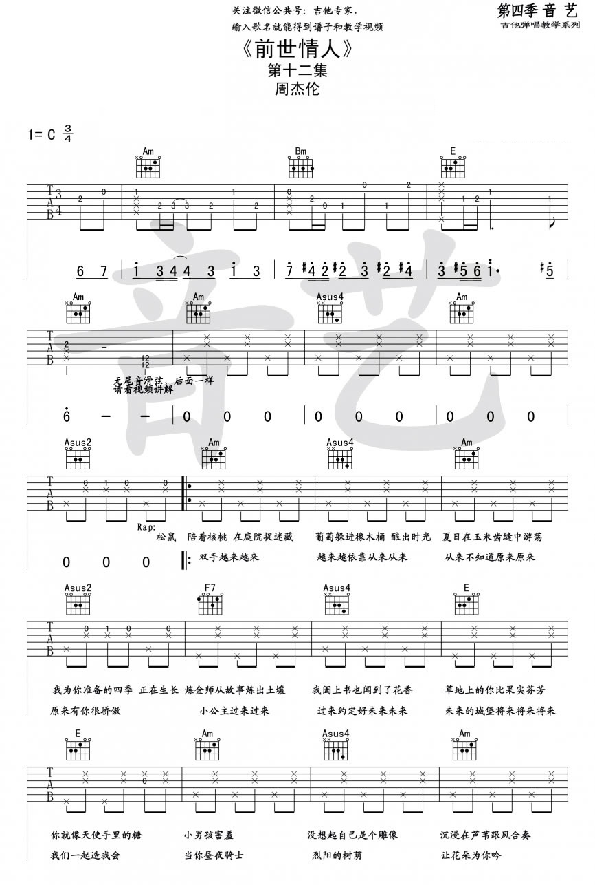 曲谱介绍: 周杰伦前世情人吉他谱,C调六线谱编配,前世情人吉他谱,完整版图片谱四张谱例分两页呈现。感谢音艺吉他扒谱制作分享。已为人父的周杰伦,将这首温柔浪漫的创作送给他的小公主女儿Hathaway。