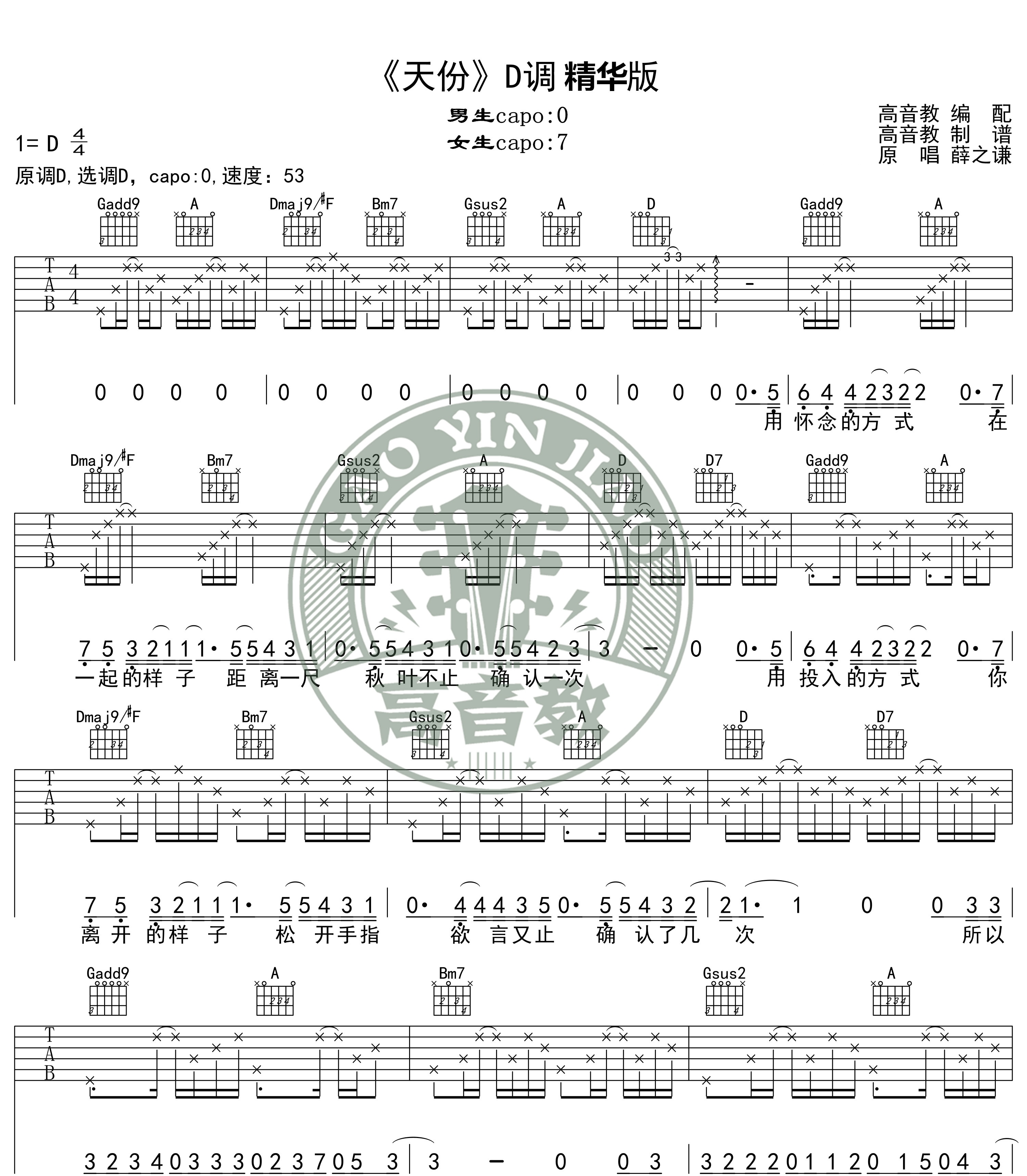 天份 薛之谦 C调入门版标准版吉他谱 - 天份 - C调吉他弹唱谱