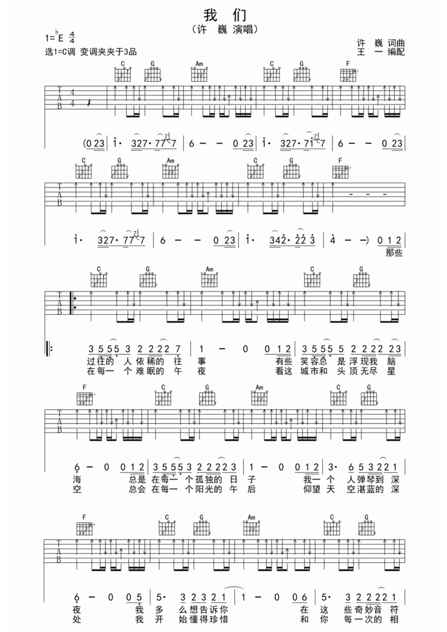 曲谱介绍: 许巍我们吉他谱,原调降E调,选调C,变调夹夹第3品。我们吉他六线谱,共三张图片。许巍的歌声总是在诉说着时光,诉说着我们每个人在生活中的成长与迷惘,给我们很多的感动,继续前行吧!谢谢许巍!