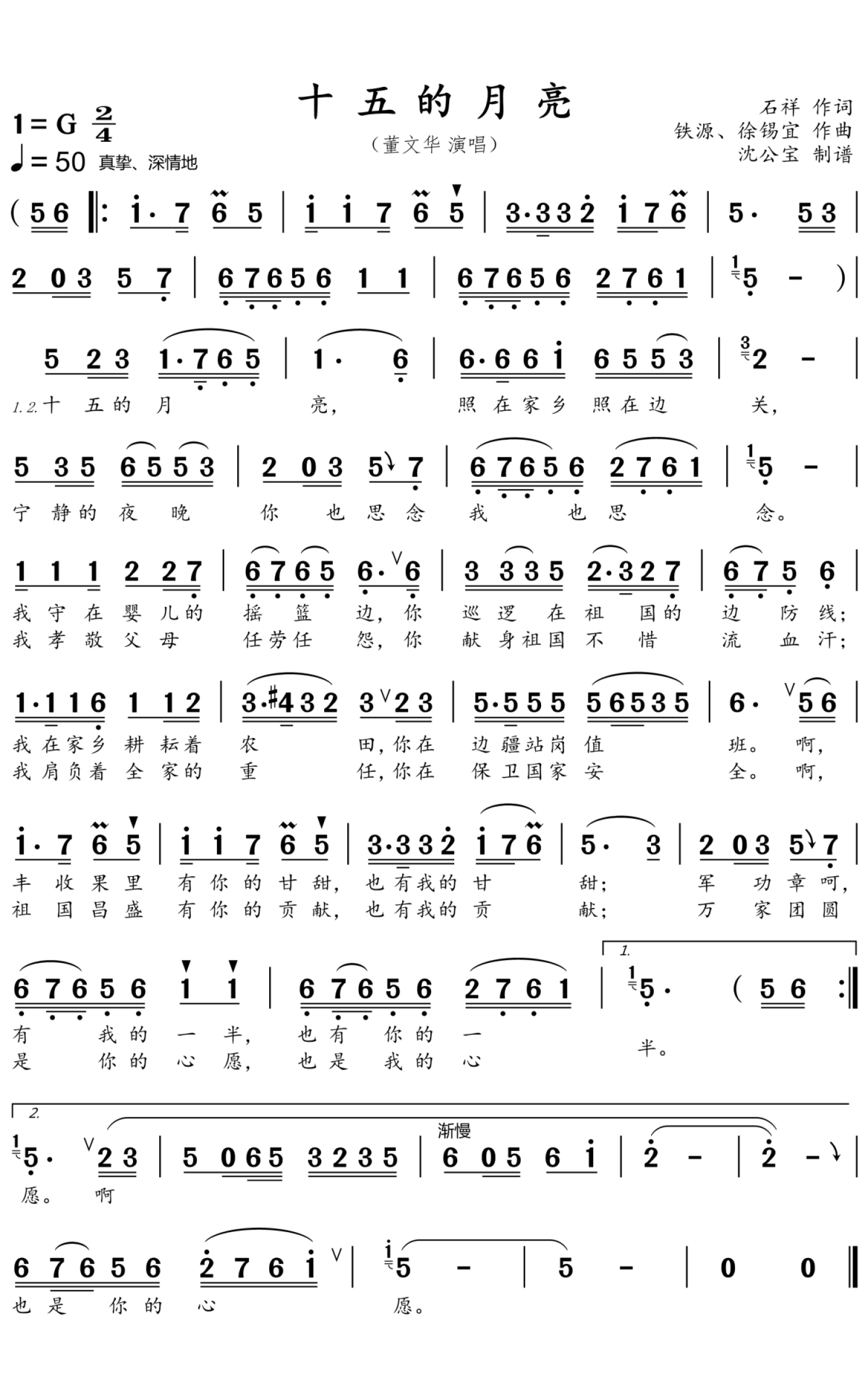 曲谱介绍: 董文华《十五的月亮》歌词_简谱