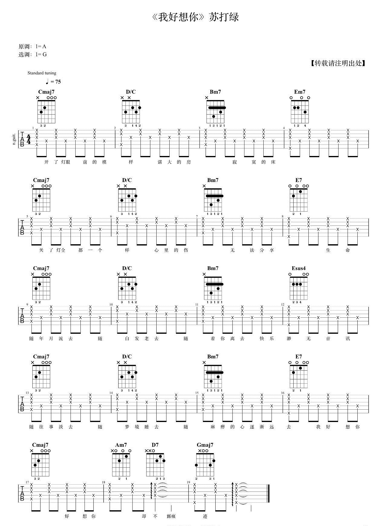 我好想你 苏打绿 G调六线吉他谱 - 我好想你 - G调吉他弹唱谱
