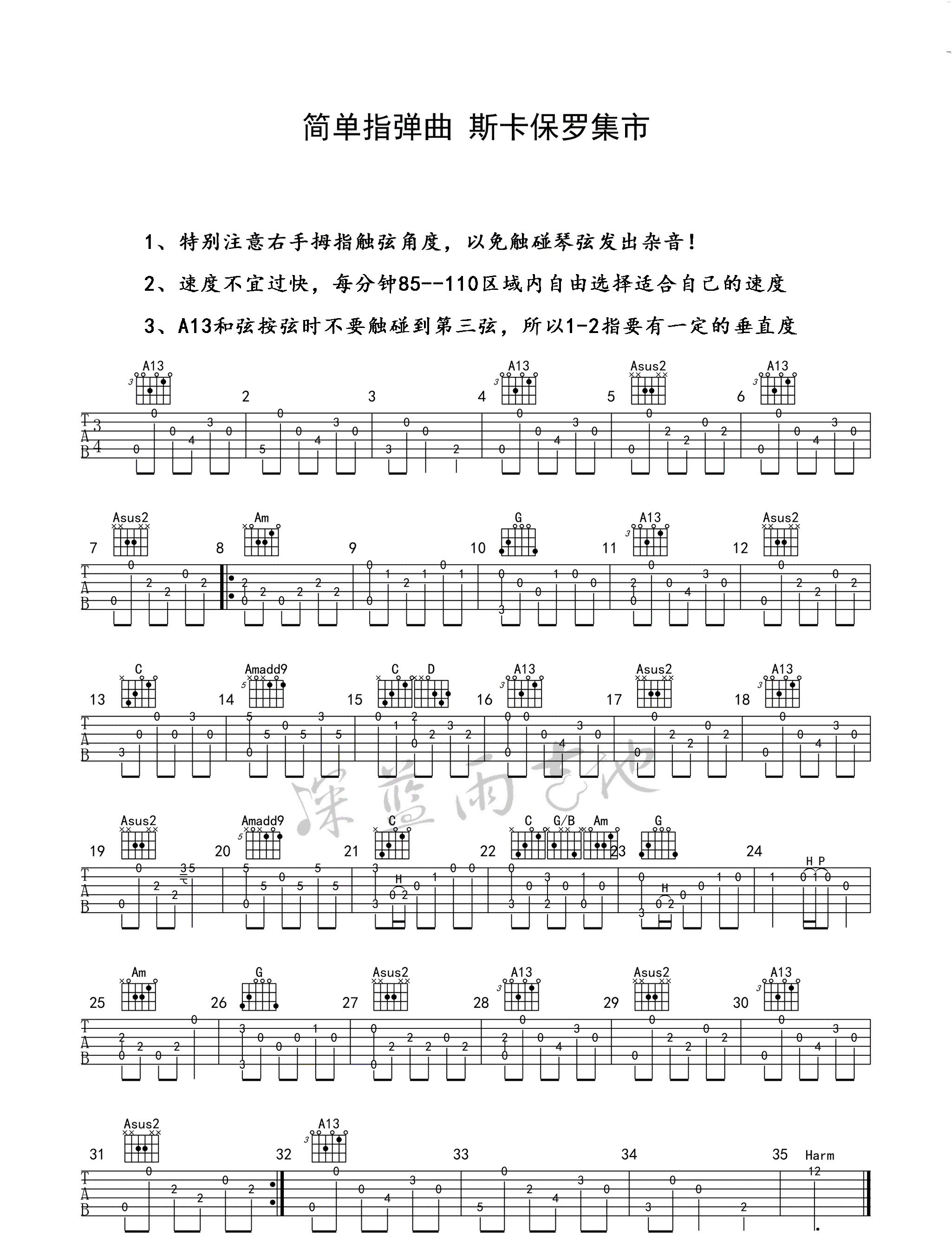 曲谱介绍: 斯卡保罗集市指弹谱,简单版,一首曲调优美动听的苏格兰民歌改编的歌曲,也是经典的《毕业生》电影主题曲,充满甜蜜和忧伤的旋律,令人沉醉。斯卡保罗集市吉他独奏谱,图片谱高清版。
