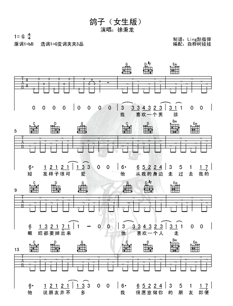 曲谱介绍: 鸽子吉他谱,徐秉龙演唱,这首歌的女生版是bB调,为了方便起见,变调夹夹在第三品,然后拿G调的和弦来弹。如果是男生的话,就直接把变调夹去掉,用G调来弹就行。   弹唱提示:首先来介绍一下这首歌用到的几个和弦,G、D、Em、C、D/#F、Bm。这里需要注意两个和弦,一个是是D/#F,它代表以#F为根音的D和弦,我一般用大拇指反扣过来,按住六弦第二品。另一个是Bm和弦,大横按对于初学者会比较难掌握。   下面介绍一下前奏,前奏用无名指按住六弦第三品,小拇指按住二弦第三品,注意第二小节倒数第二个音和第三个音上面有个H,H代表hammer on击弦,也就是右手只弹一下,第二个音是左手击弦发出的。   然后说说节奏型,整首歌只用了一个节奏型。如果一小节有两个和弦,弹两遍“根、四、二、三”。如果一个小节只有一个和弦,弹成“根、四、三、四、二~、三、四”,D和弦比较特殊,因为根音在四弦,所以弹成“根、三、二、三”。   总结一下,这首歌和弦难度,节奏型难度,总体很简单,唯一难点是Bm和弦,适合学吉他一个月左右,能按大横按的宝宝。