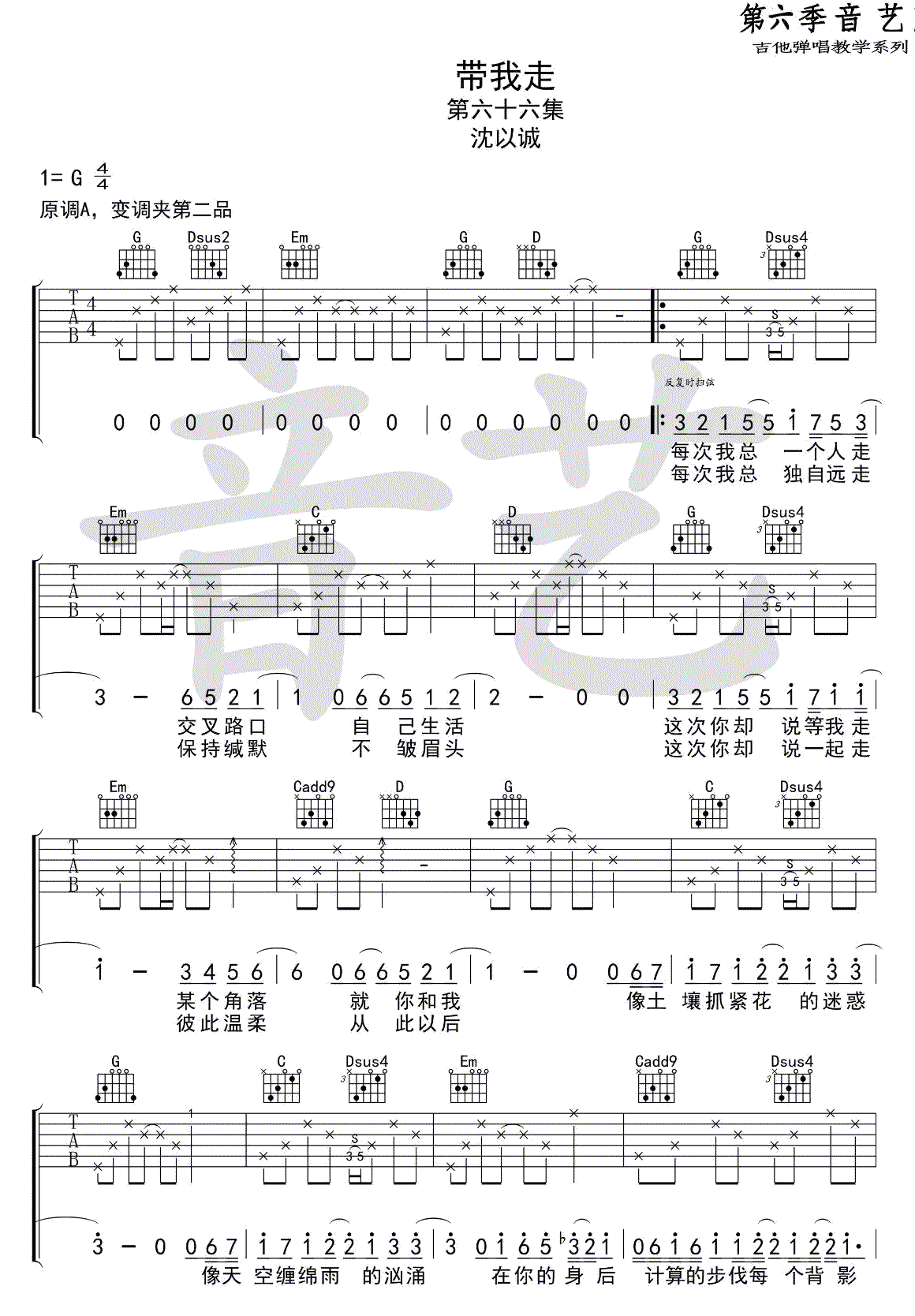 当前位置:琴谱网>吉他弹唱>带我走 沈以诚 G调