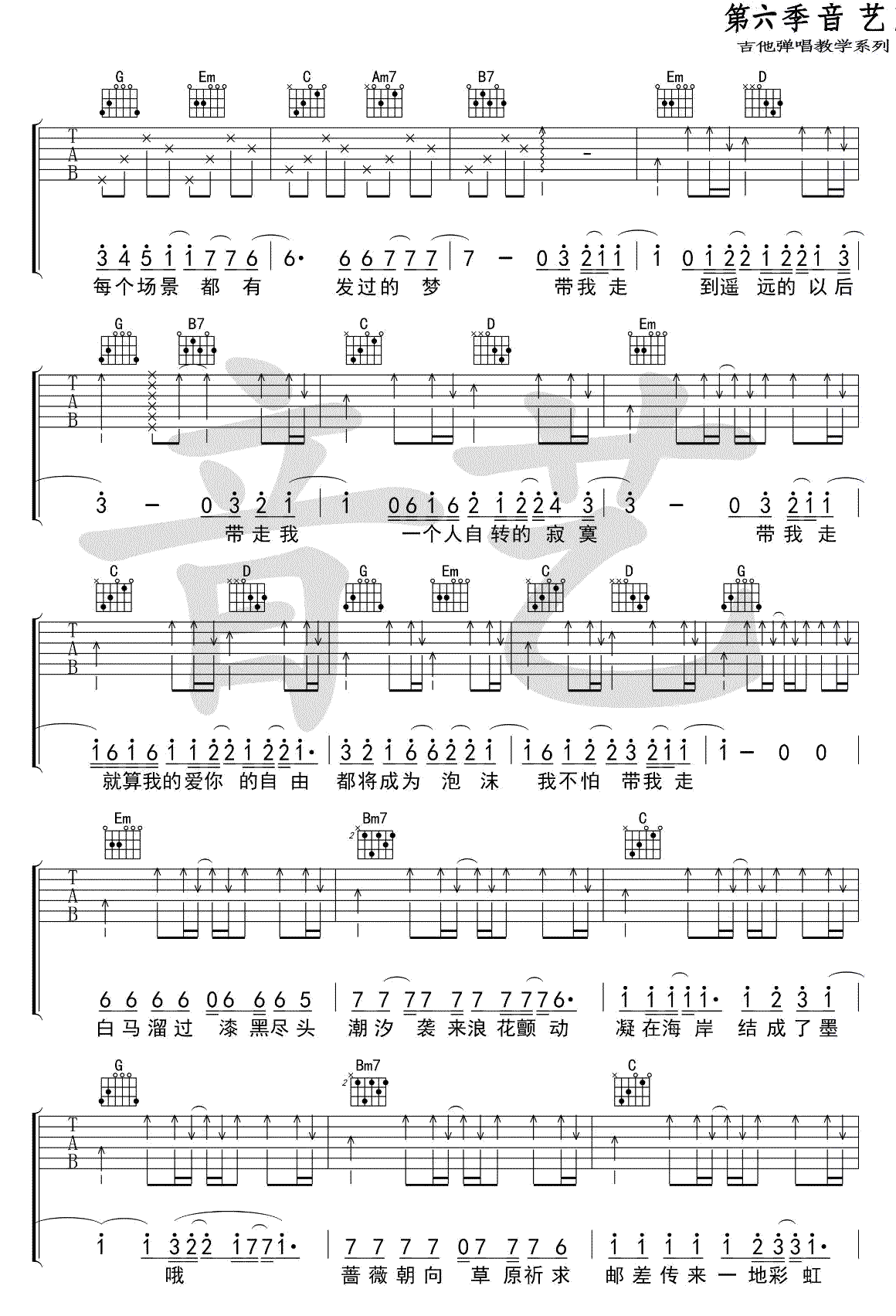 曲谱介绍: 带我走吉他谱,沈以诚演唱,带我走六线谱,G调指法,变调夹夹第二品,高清图片谱,杨丞琳原唱。 《带我走》是由吴青峰作词作曲,杨丞琳演唱的一首歌曲,收录在其《半熟宣言》专辑中,这首歌也是电视剧《不良笑花》的片尾曲。 感谢摇滚猫老师根据沈以诚的演唱版本编配,谱子没有全按他的指法来,大家弹唱的时候顺手就好,不要被谱子约束!