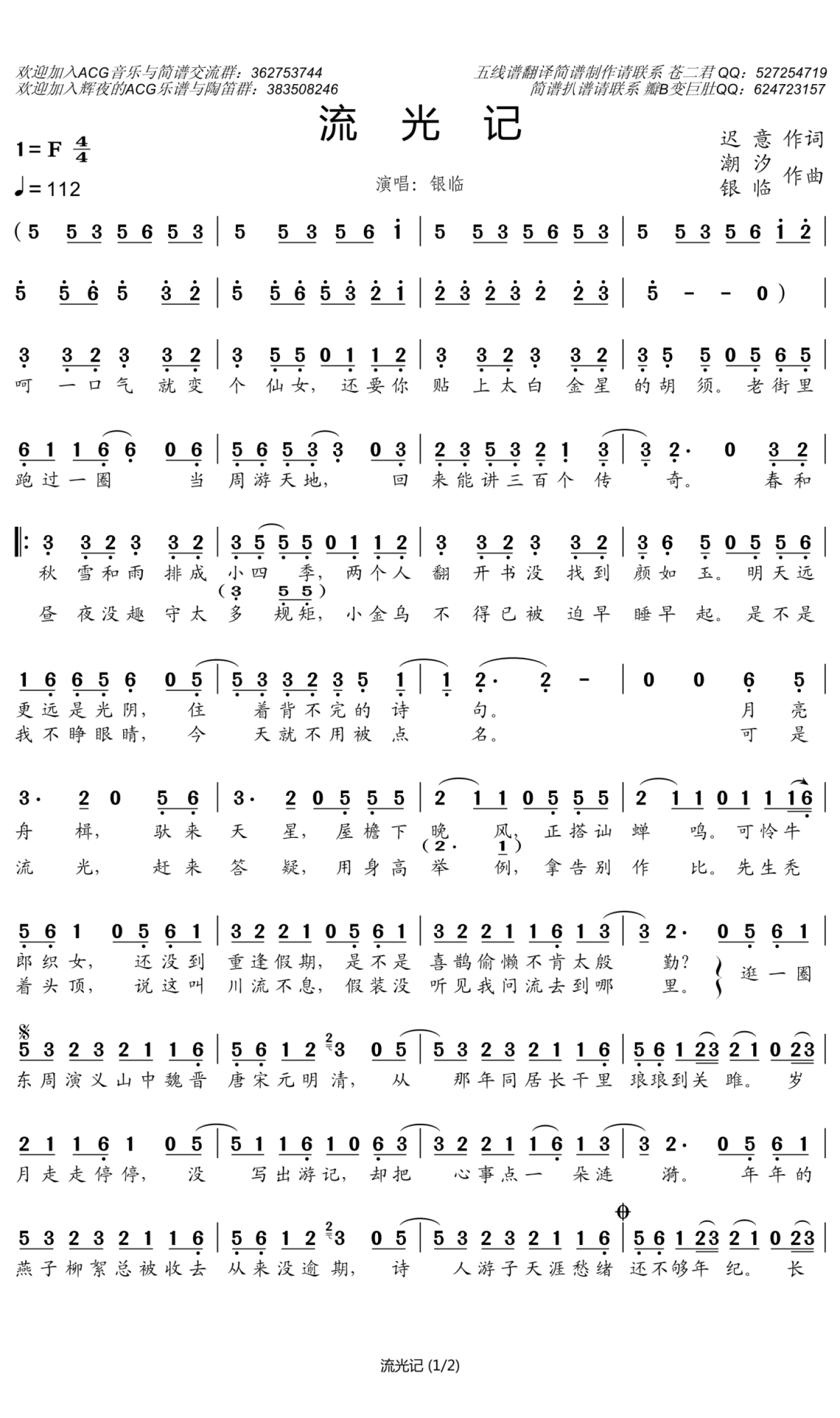 曲谱介绍: 银临《流光记》歌词_简谱