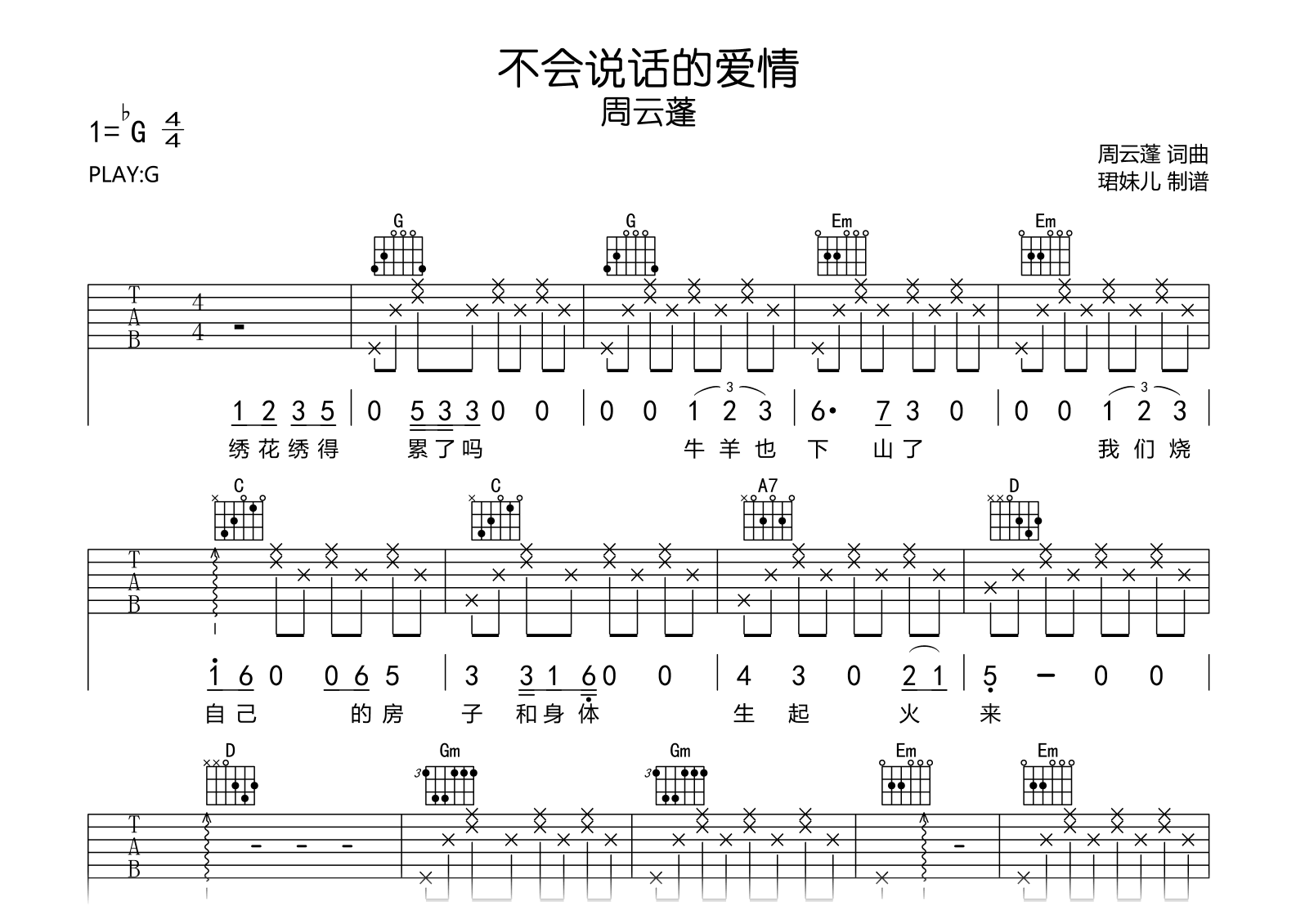 曲谱介绍: 不会说话的爱情吉他谱,周云蓬演唱,《不会说话的爱情》吉他弹唱谱,选用G调和弦指法编配,速度75BPM,演奏难度较简单易上手。