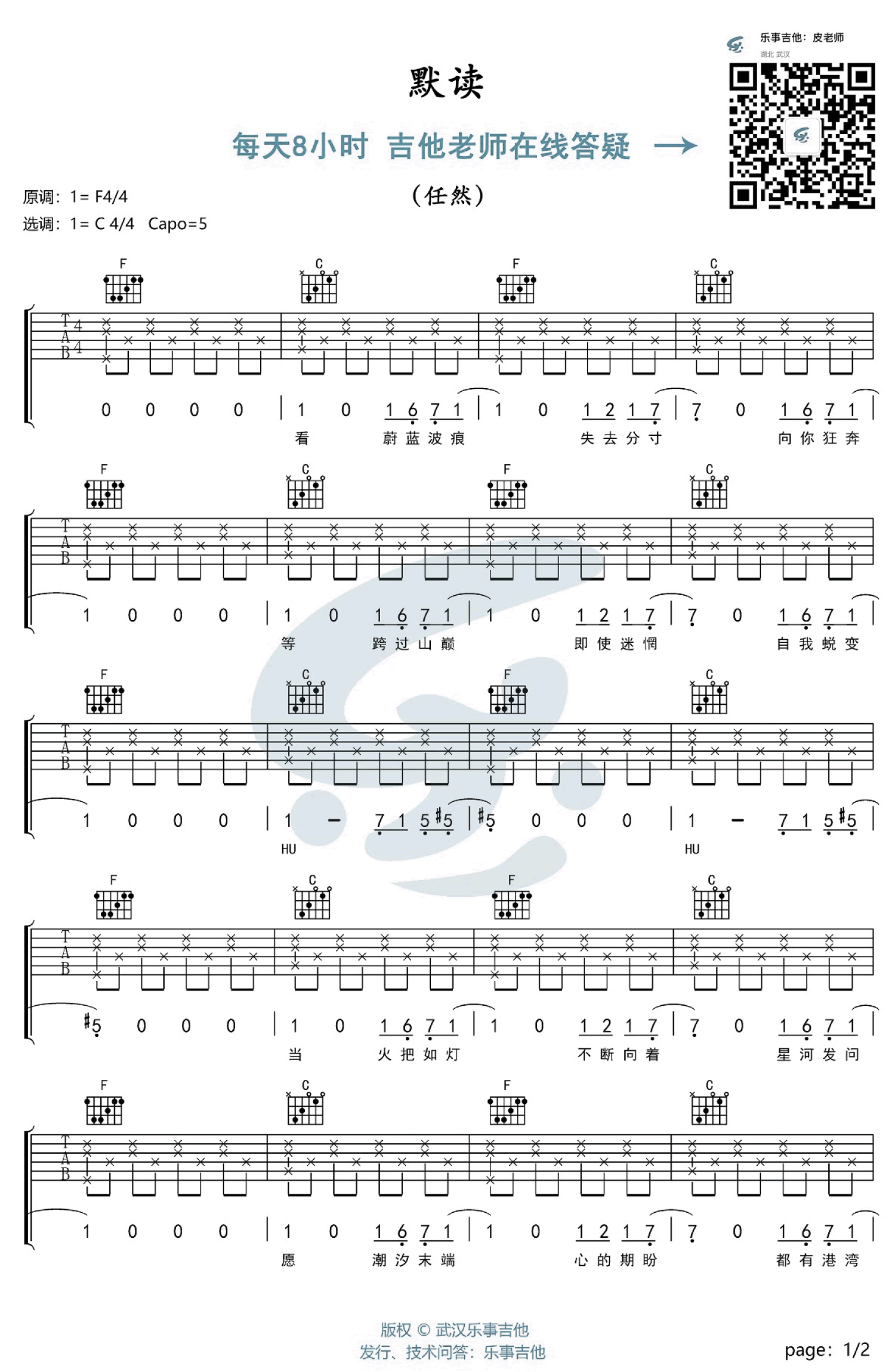 曲谱介绍: 默读吉他谱,任然演唱Priest小说《默读》官方主题曲,原调F选调C,Capo夹五品。这是关于一本书的歌曲,特为晋江文学城小说作品打造,旋律舒缓,歌声温柔。听罢让人意犹未尽,给人无限遐想的空间。喜欢具有文学美感的歌词,关于作品讲得什么,有兴趣的琴友可以自己去读一读。