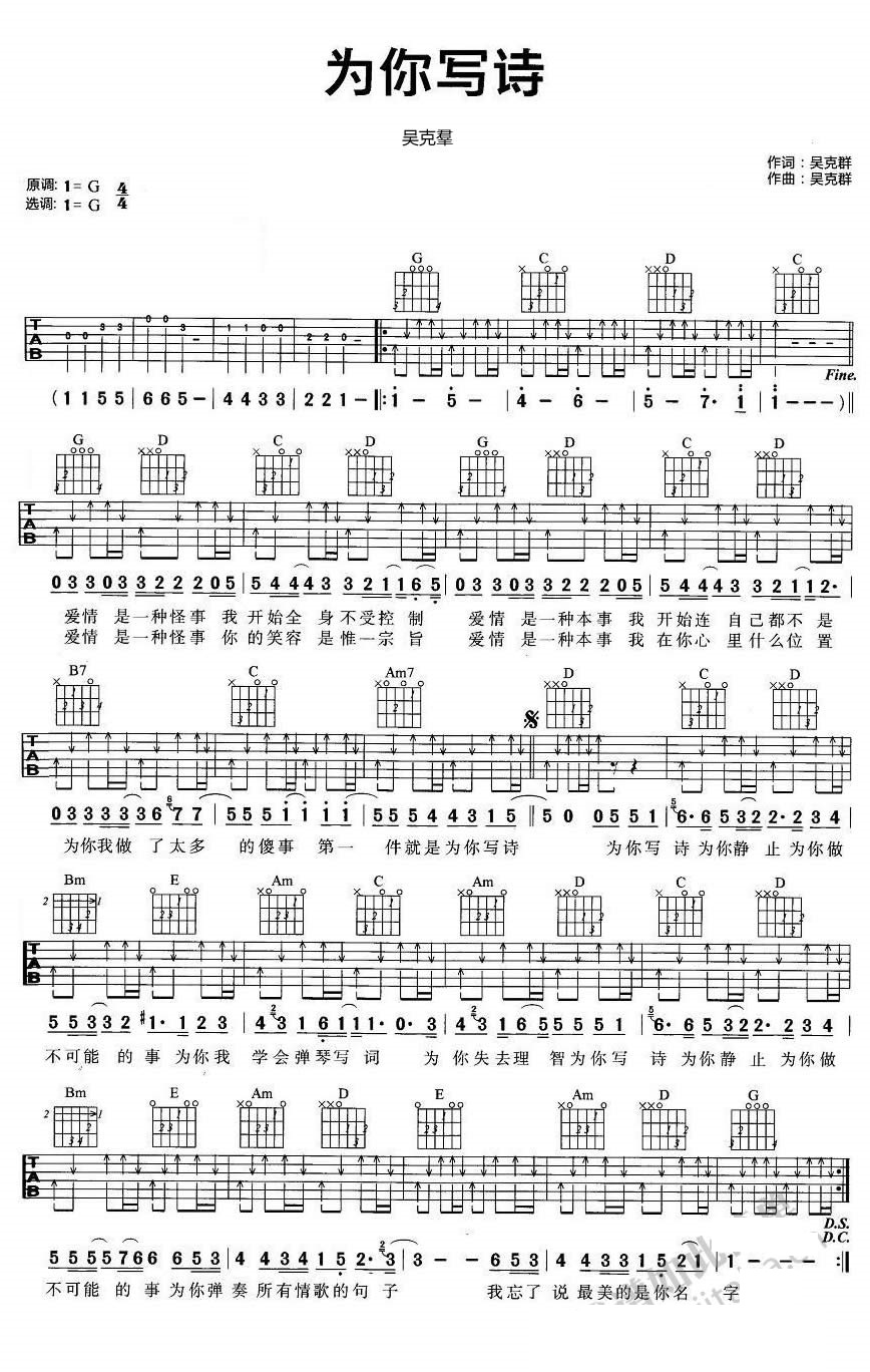 为你写诗 吴克羣 G调指法六线吉他谱 - 为你写诗 - G调吉他弹唱谱
