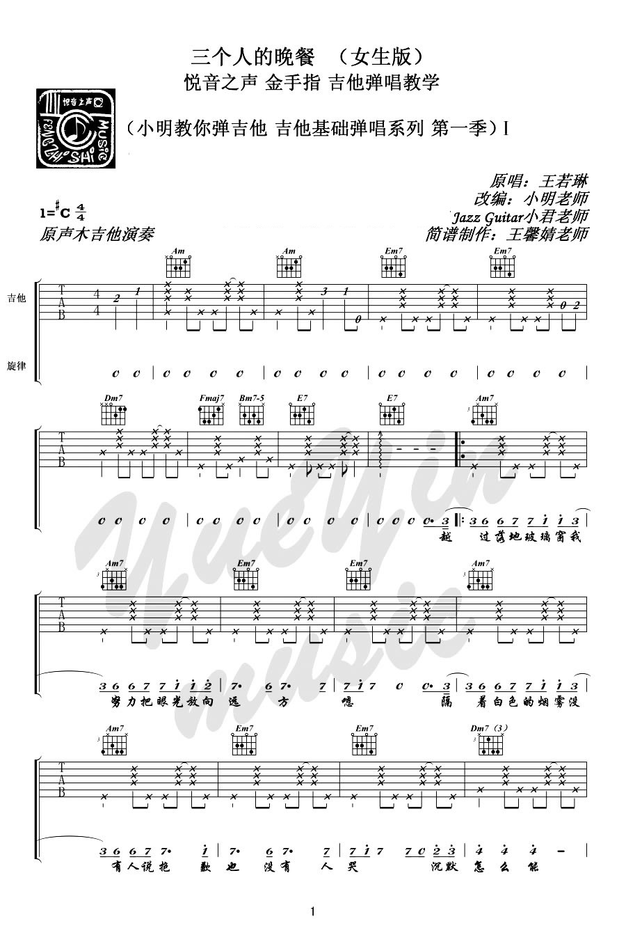 曲谱介绍: 王若琳三个人的晚餐吉他谱,#C调女生版,三个人的晚餐吉他六线谱,四张图片谱分成两页显示。原唱黄韵玲版本的听起来五味杂陈的心碎,然而王若琳爵士味道浓,唱出一种慵懒小资的味道,感谢悦音之声工作室小君老师扒谱制谱,小明老师吉他弹唱教学。