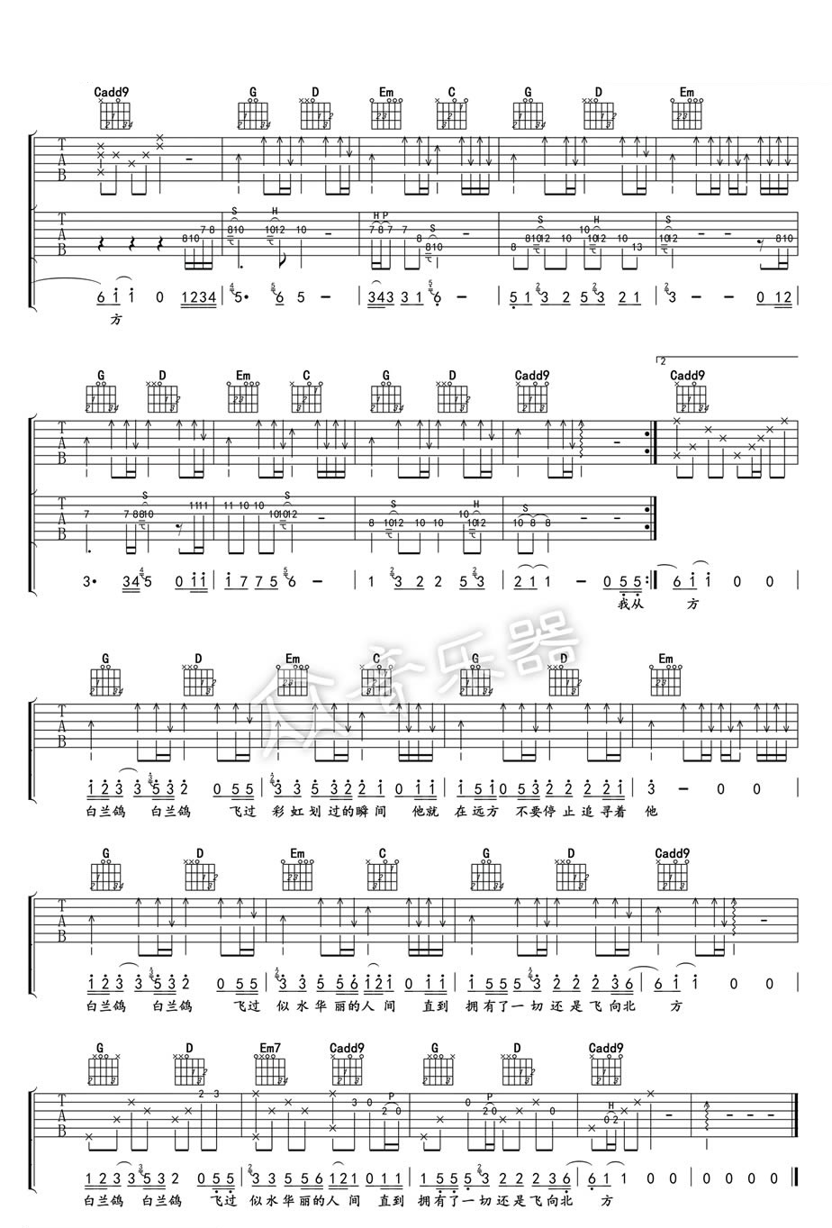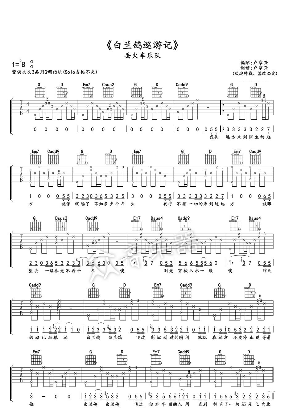 当前位置:琴谱网>吉他弹唱>白兰鸽巡游记 丢火车乐队 G调指法高清版