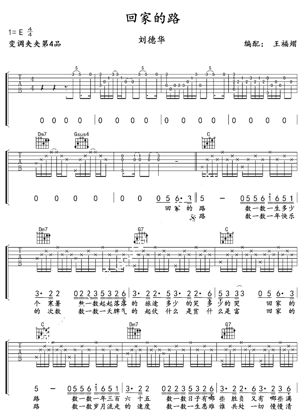 曲谱介绍: 刘德华回家的路吉他谱,六线谱图片高清版,E调变调夹夹第四品,感谢王福熠编配,回家的路吉他弹唱谱,总提编排简单容易上手,除了前奏稍有难度,但是大多也是均匀的16分音符。弹奏的时候,琴友们需要注意吉他谱中反复的部分,主歌部分需要要多唱几遍。这首歌是刘德华主演电影《失孤》的主题曲,温暖动听的歌声,朴实感人的歌词,唱出了每个出外的游子思乡返家的心情,回家的路也成为岁末春运的主题曲。