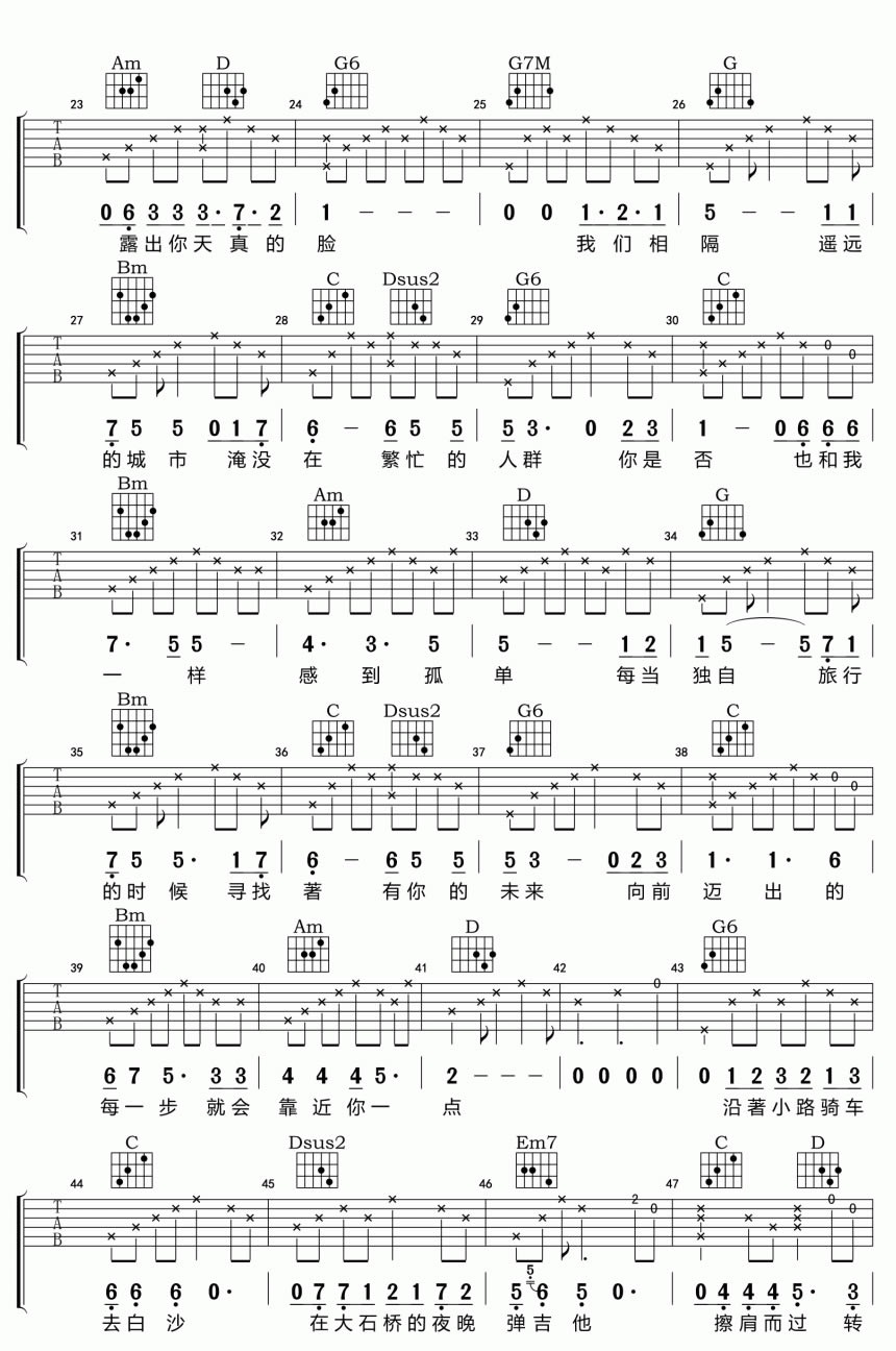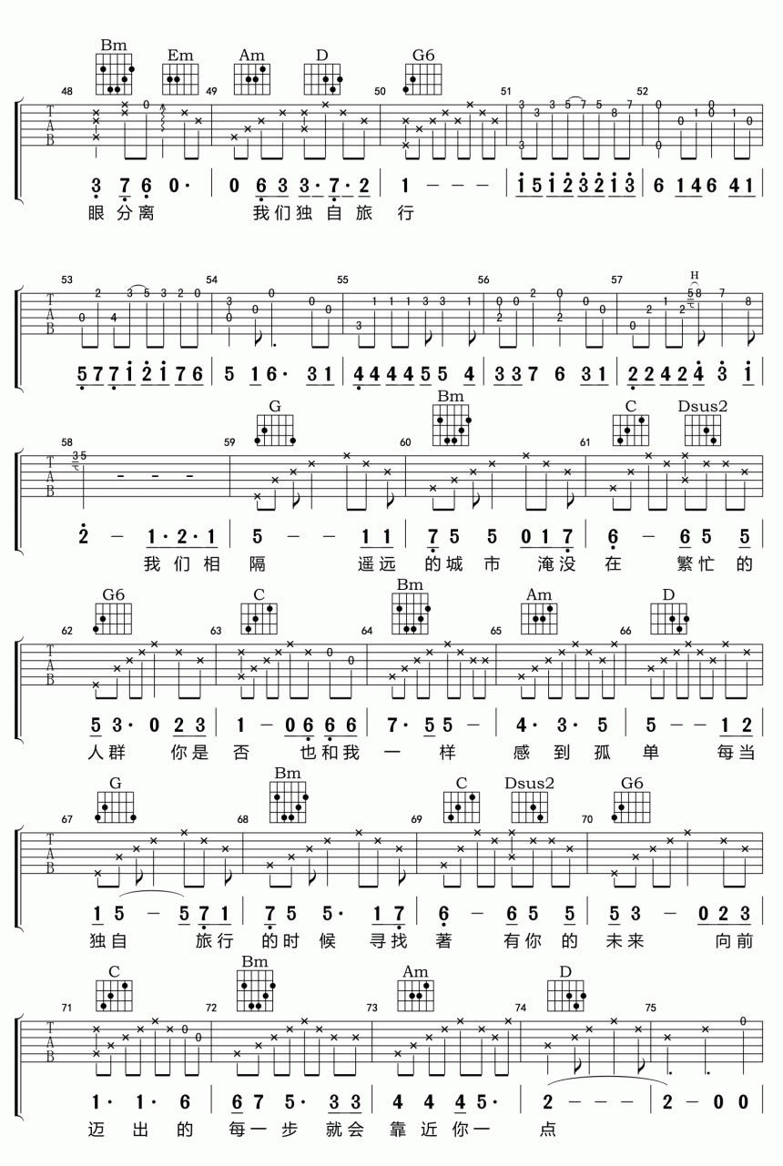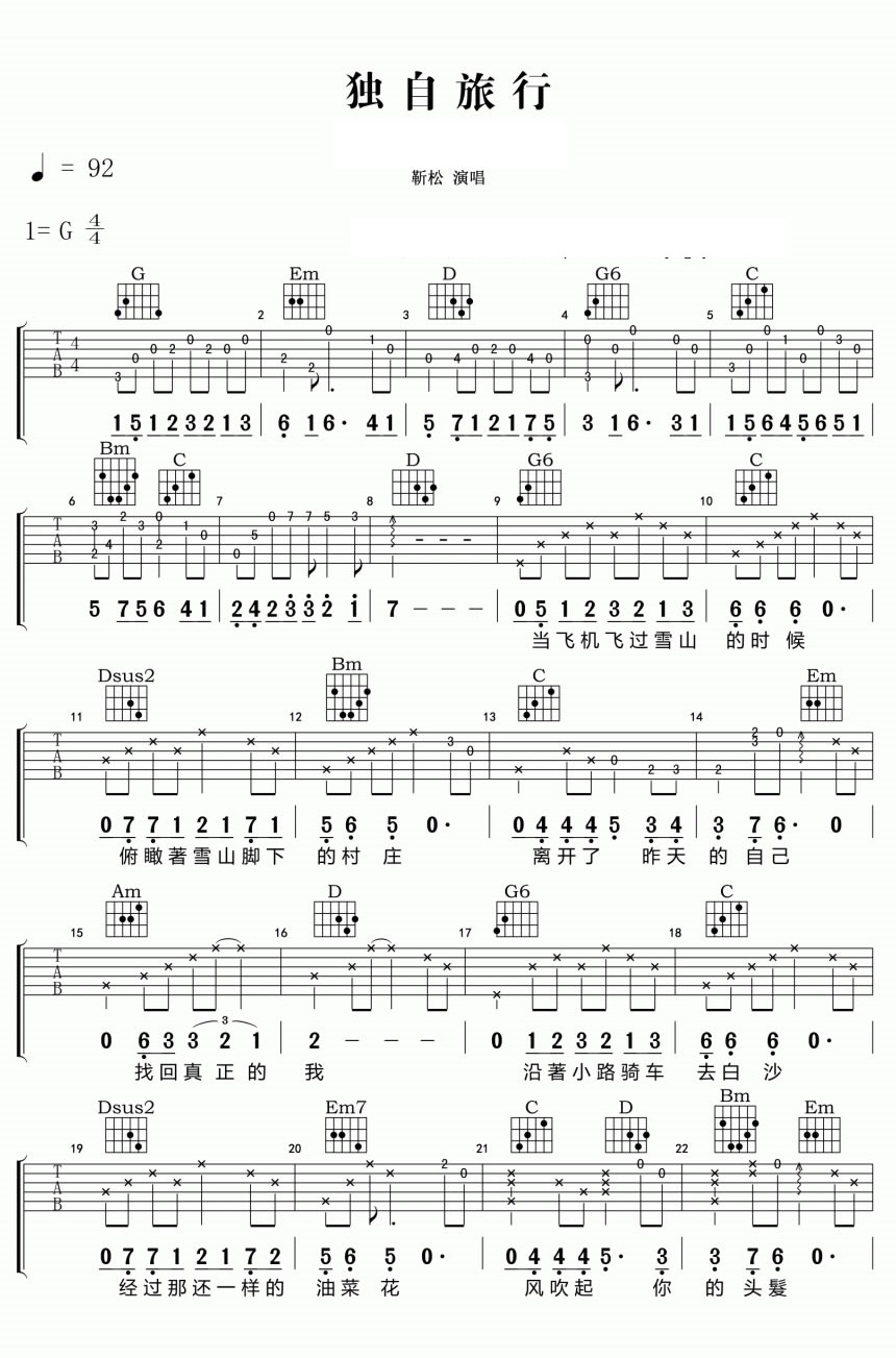 当前位置:琴谱网>吉他弹唱>独自旅行 靳松 G调指法完整版