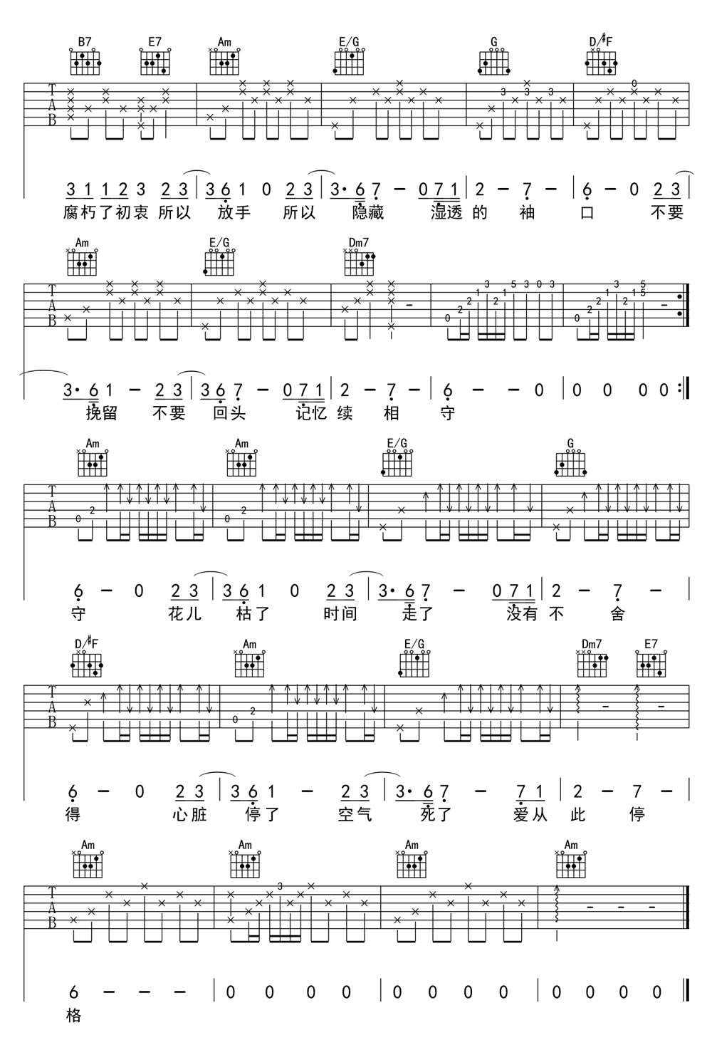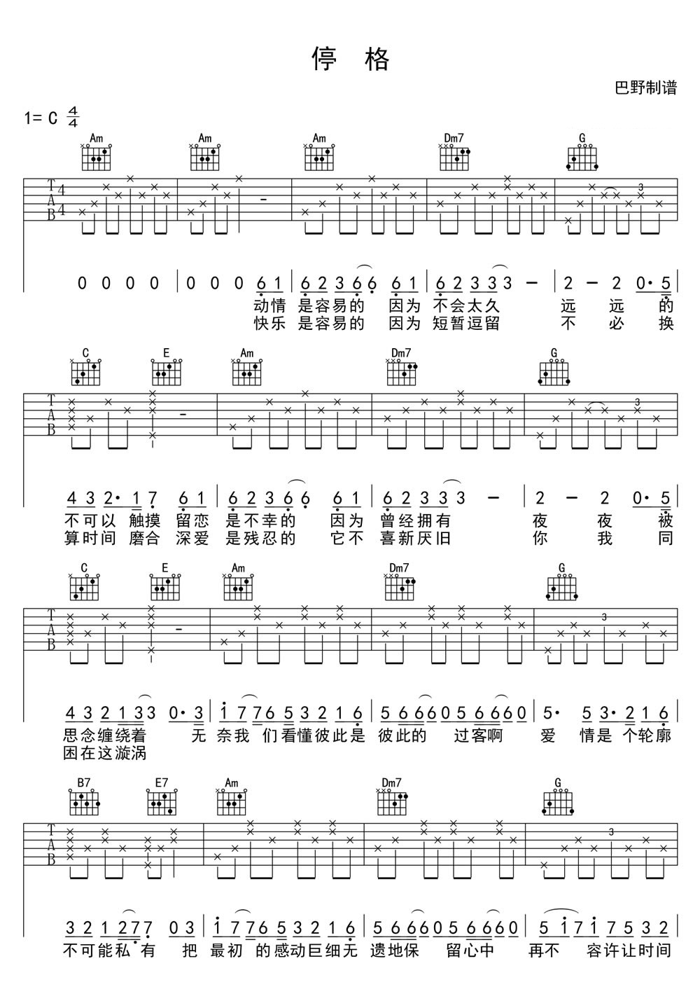 停格 张学友 六线吉他谱 - 停格 - 吉他弹唱谱