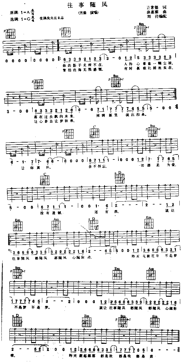 曲谱介绍: 《往事随风》吉他弹唱谱,共有1张高清图谱,免翻页排版设计。
