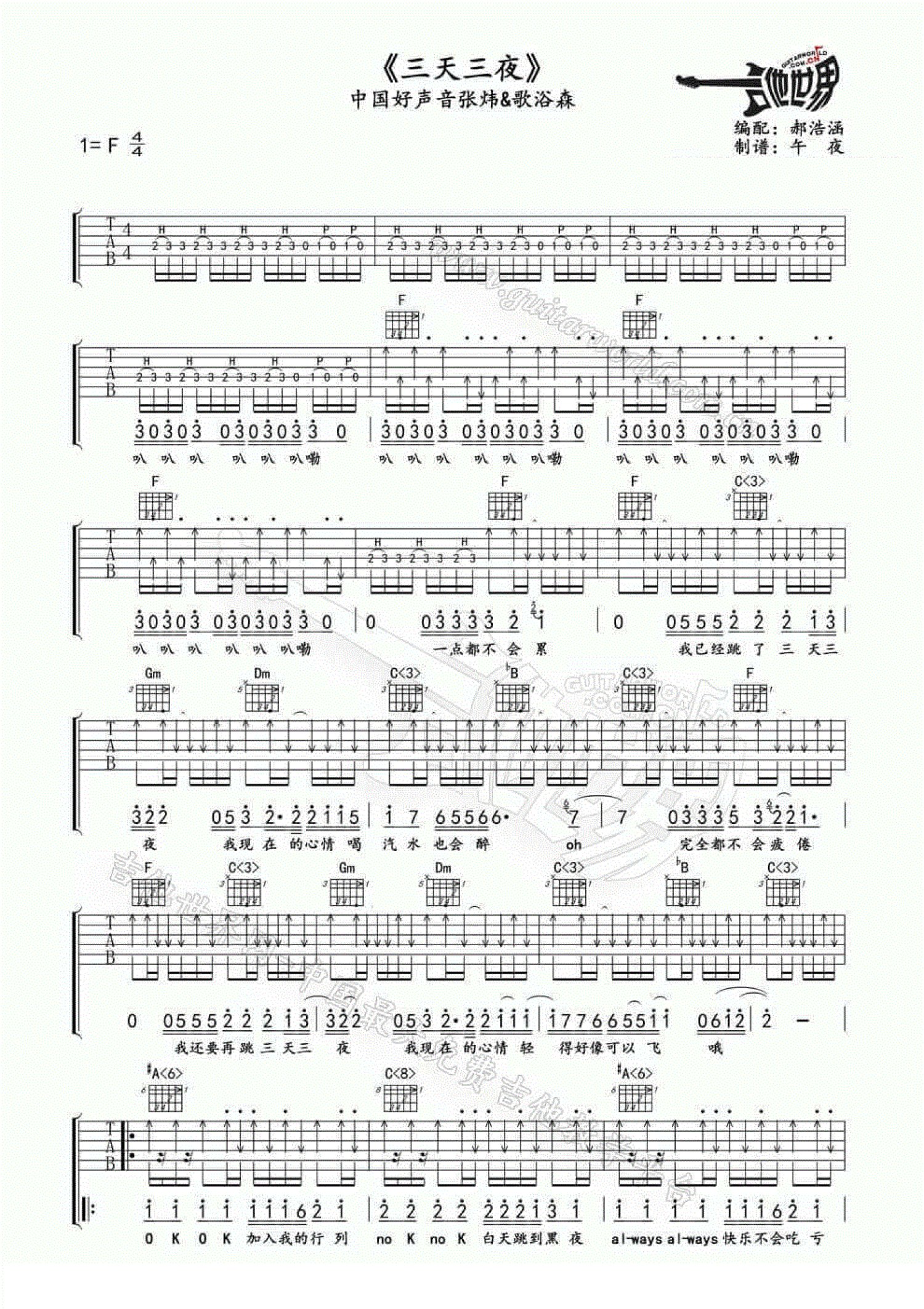 曲谱介绍: 歌浴森-三天三夜吉他谱  原唱张惠妹,一首动感摇摆舞曲音乐作品。中国好声音节目歌浴森翻唱。