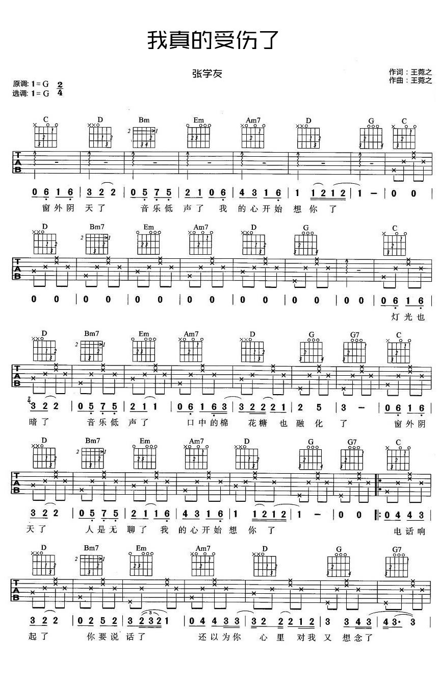曲谱介绍: 张学友我真的受伤了吉他谱,选用G调指法,六线谱编配。我真的受伤了吉他谱,弹唱图片谱,张学友的一首经典伤情歌曲,音乐才女王菀之创作的歌词和旋律配搭恰到好处,对一个人失恋时周围的细节刻画入微。