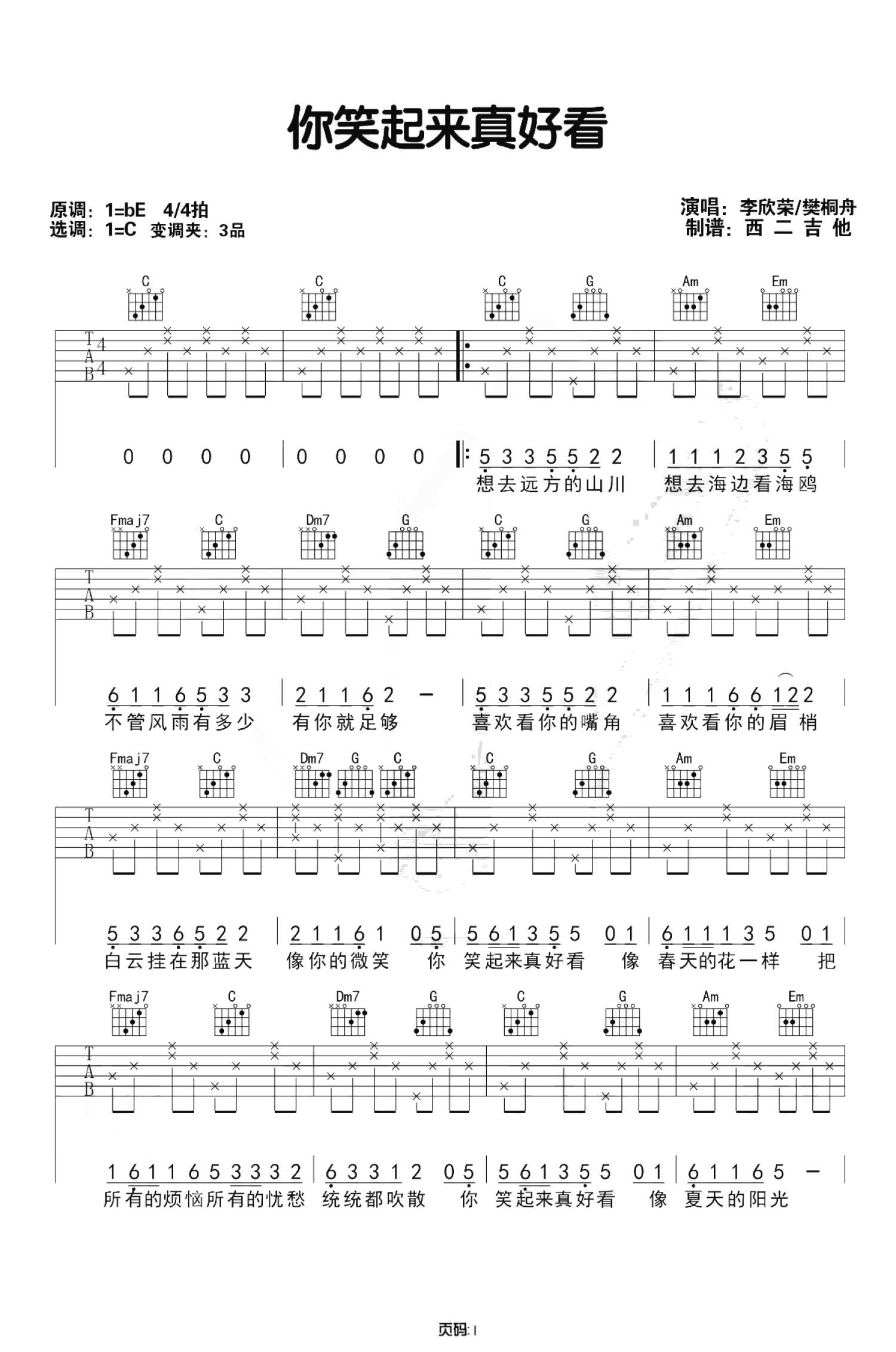 你笑起来真好看吉他谱 - 李昕融、樊桐舟和李凯稠 - C调吉他弹唱谱