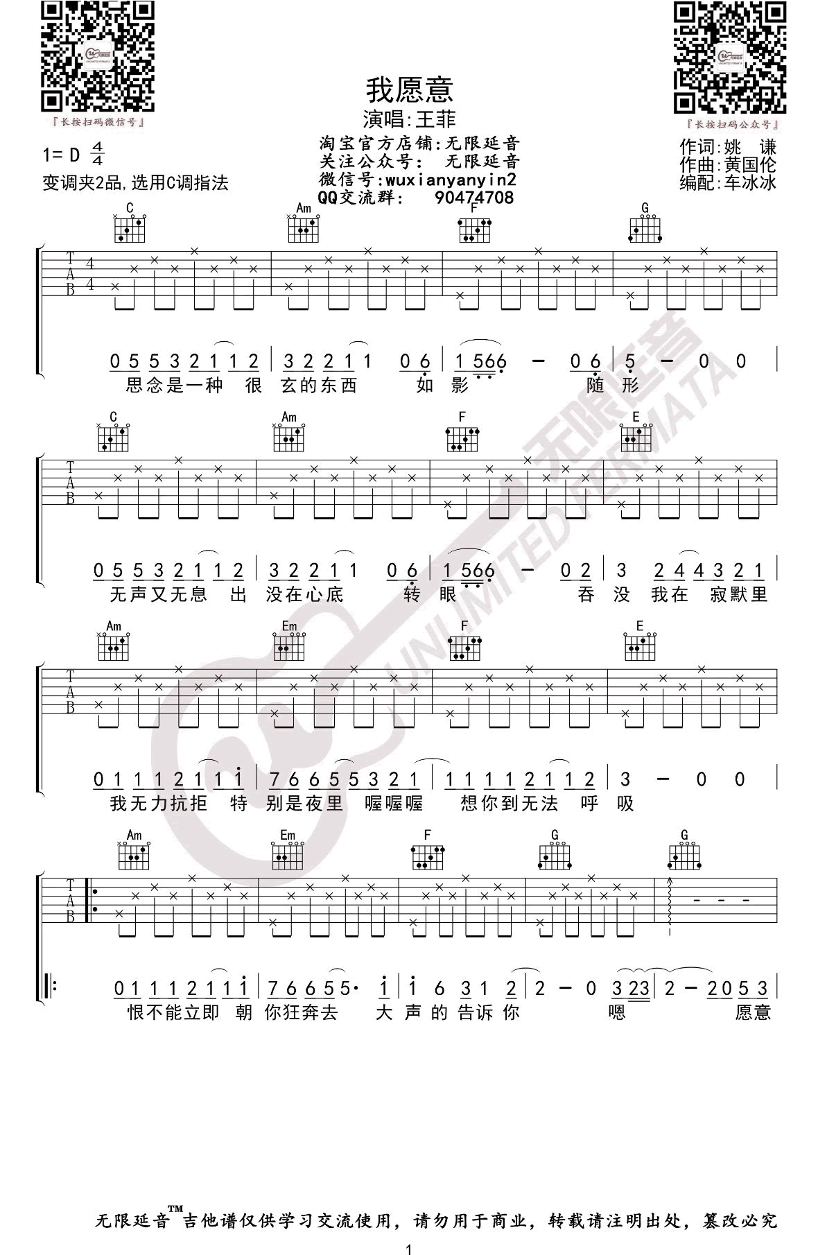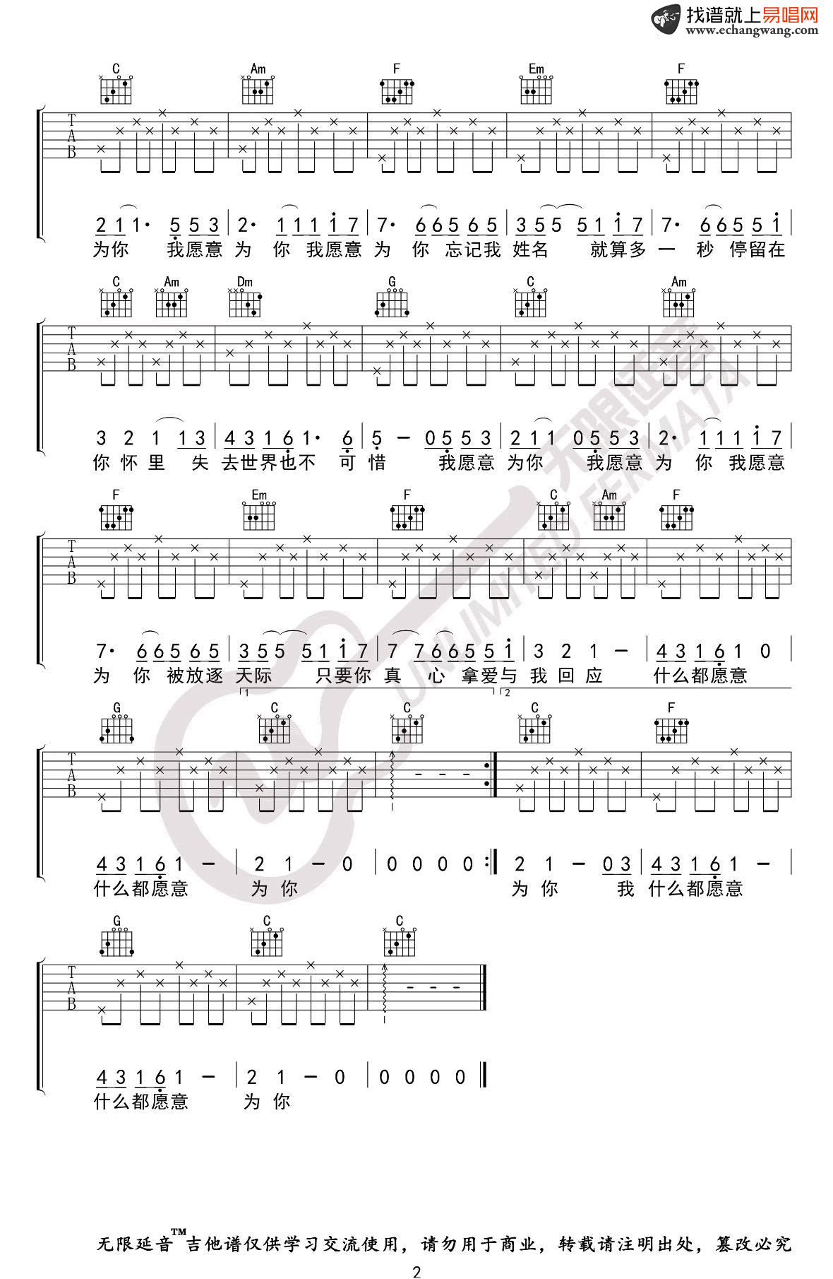 曲谱介绍: 王菲《我愿意》吉他弹唱谱,共有2张高清图谱,免翻页排版设计。
