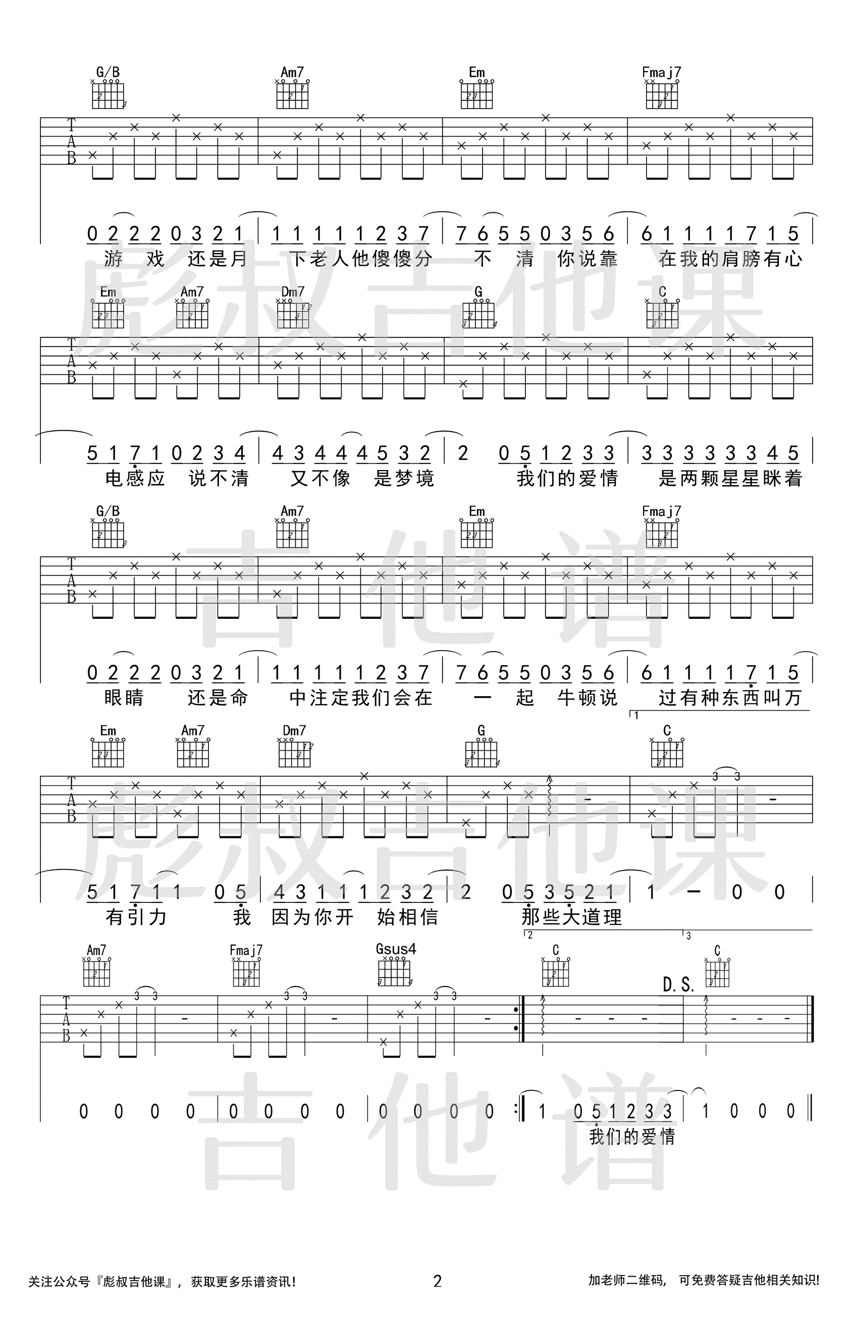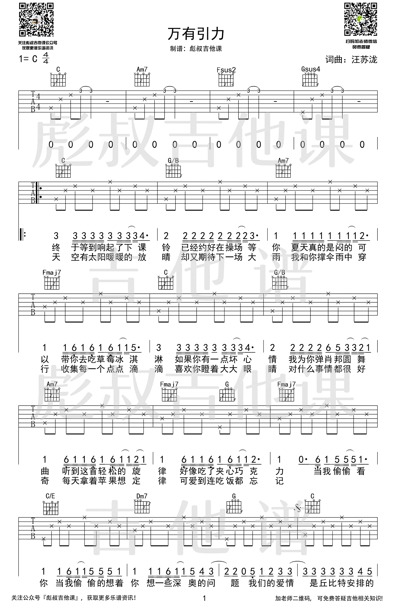 曲谱介绍: 《万有引力》,汪苏泷演唱的一首浪漫情歌,万有引力六线谱,C调和弦编配,两张高清弹唱图片谱,彪叔吉他课出品,琴谱网网上传更新。 魅力十足的一首歌曲,将恋人间互相吸引的那种心电感应,比喻成爱情的万有引力定律,轻快地旋律,仿佛带着甜蜜的气息,诉说一段青涩美妙的爱恋。