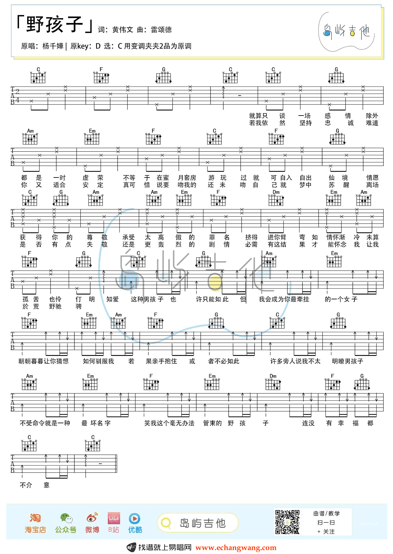 曲谱介绍: 杨千嬅《野孩子》吉他弹唱谱,共有2张高清图谱,免翻页排版设计。