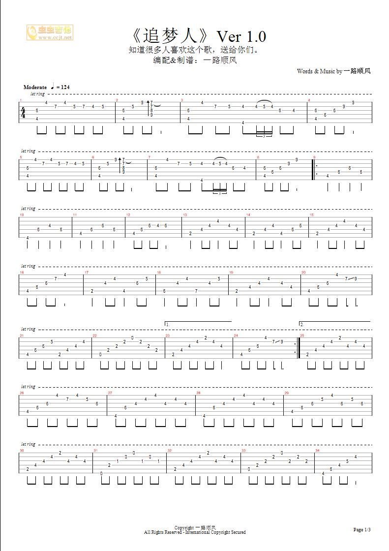 曲谱介绍: 《追梦人》吉他弹唱谱,共有3张高清图谱。